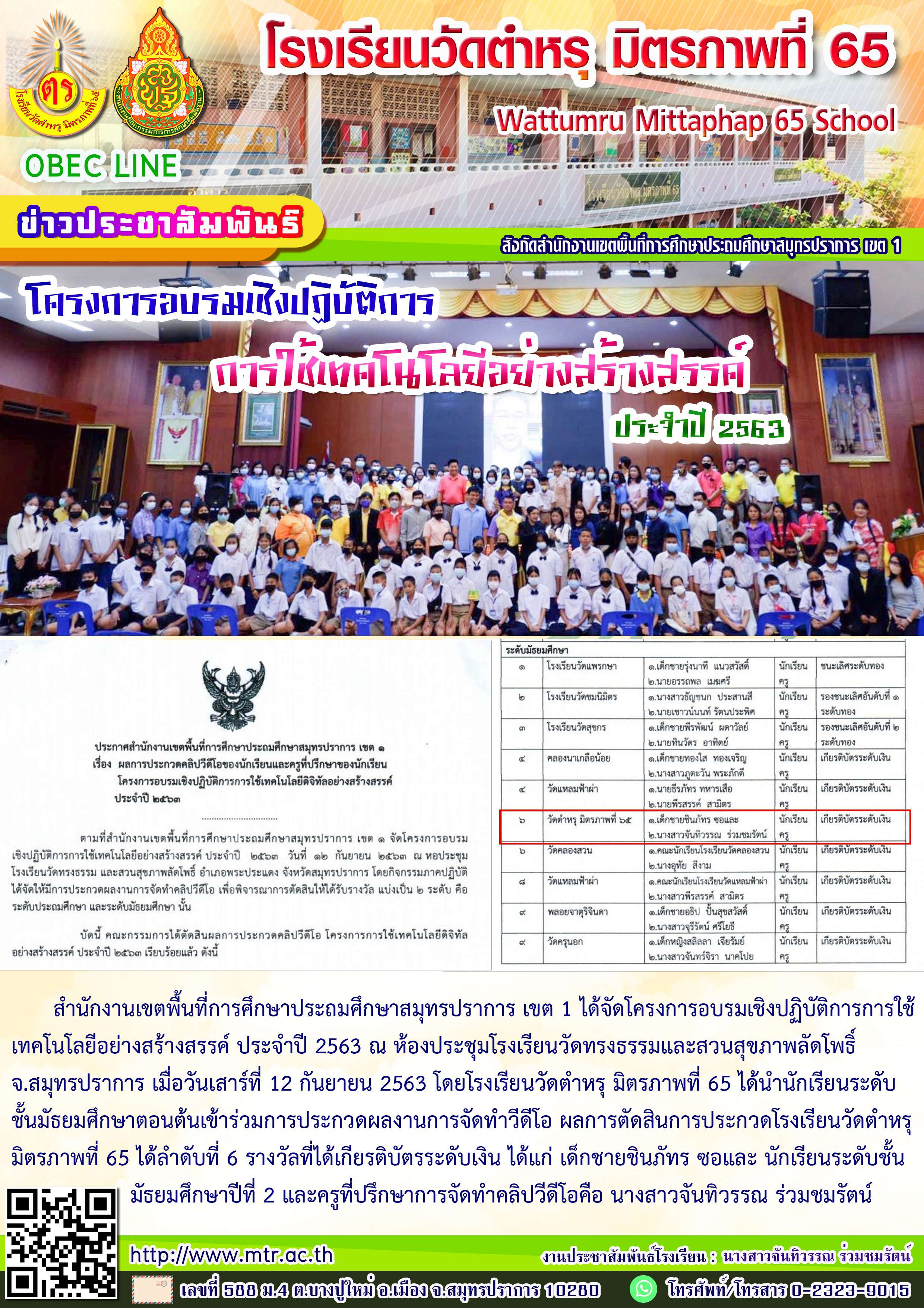 สำนักงานเขตพื้นที่การศึกษาประถมศึกษาสมุทรปราการ เขต 1 ได้จัดโครงการอบรมเชิงปฏิบัติการการใช้เทคโนโลยีอย่างสร้างสรรค์ ประจำปี 2563 ณ ห้องประชุมโรงเรียนวัดทรงธรรมและสวนสุขภาพลัดโพธิ์ จ.สมุทรปราการ เมื่อวันเสาร์ที่ 12 กันยายน 2563 โดยโรงเรียนวัดตำหรุ มิตรภาพที่ 65 ได้นำนักเรียนระดับชั้นมัธยมศึกษาตอนต้นเข้าร่วมการประกวดผลงานการจัดทำวีดีโอ ผลการตัดสินการประกวดโรงเรียนวัดตำหรุ มิตรภาพที่ 65 ได้ลำดับที่ 6 รางวัลที่ได้เกียรติบัตรระดับเงิน ได้แก่ เด็กชายชินภัทร ซอและ นักเรียนระดับชั้นมัธยมศึกษาปีที่ 2 และครูทีี่ปรึกษาการจัดทำคลิปวีดีโอคือ นางสาวจันทิวรรณ ร่วมชมรัตน์