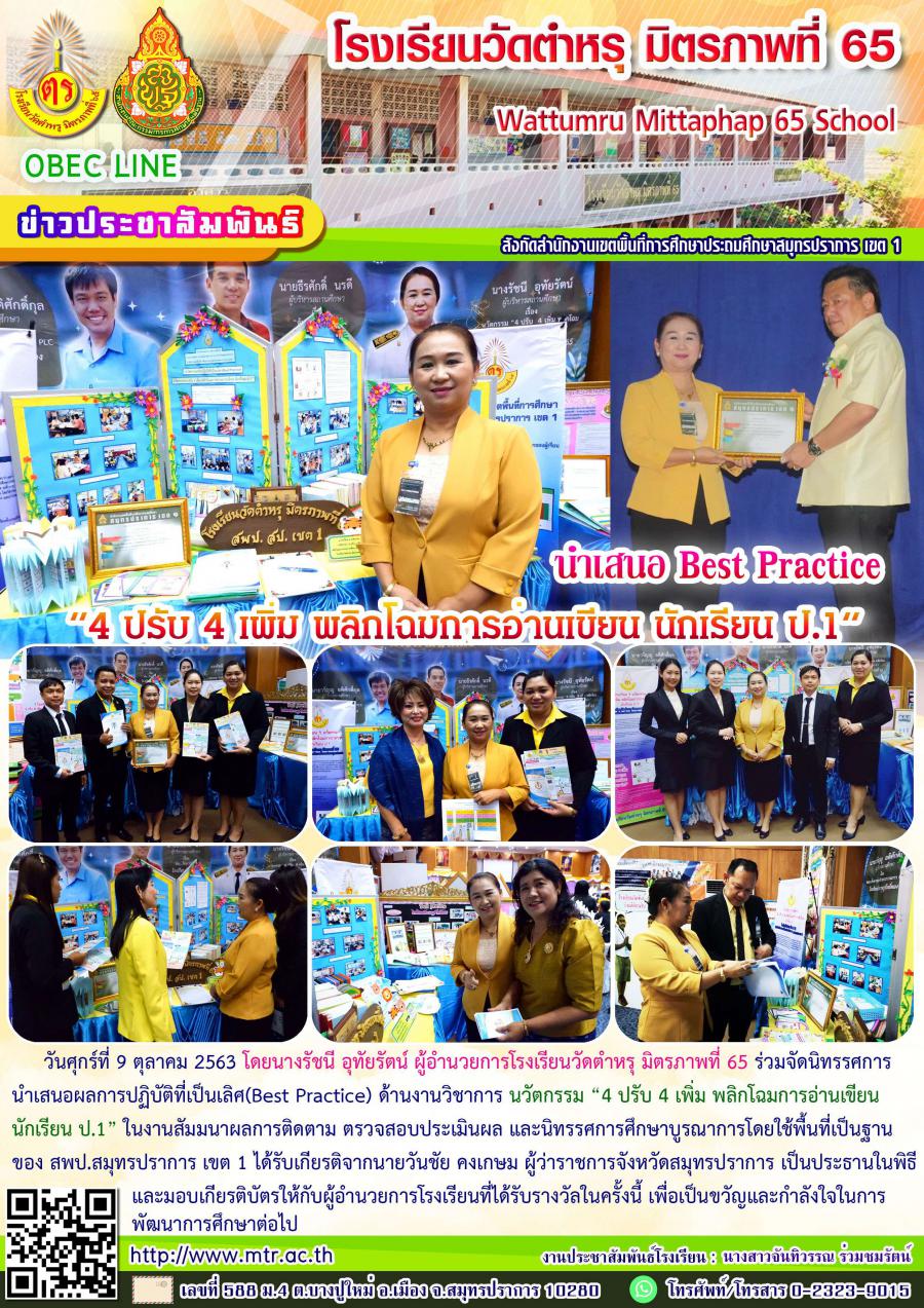 วันศุกร์ที่ 9 ตุลาคม 2563 โดยนางรัชนี อุทัยรัตน์ ผู้อำนวยการโรงเรียนวัดตำหรุ มิตรภาพที่ 65 ร่วมจัดนิทรรศการนำเสนอผลการปฏิบัติที่เป็นเลิศ(Best Practice) ด้านงานวิชาการ นวัตกรรม “4 ปรับ 4 เพิ่ม พลิกโฉมการอ่านเขียน นักเรียน ป.1” ในงานสัมมนาผลการติดตาม ตรวจสอบประเมินผล และนิทรรศการศึกษาบูรณาการโดยใช้พื้นที่เป็นฐาน ของ สพป.สมุทรปราการ เขต 1 ได้รับเกียรติจากนายวันชัย คงเกษม ผู้ว่าราชการจังหวัดสมุทรปราการ เป็นประธานในพิธีและมอบเกียรติบัตรให้กับผู้อำนวยการโรงเรียนที่ได้รับรางวัลในครั้งนี้ เพื่อเป็นขวัญและกำลังใจในการพัฒนาการศึกษาต่อไป
