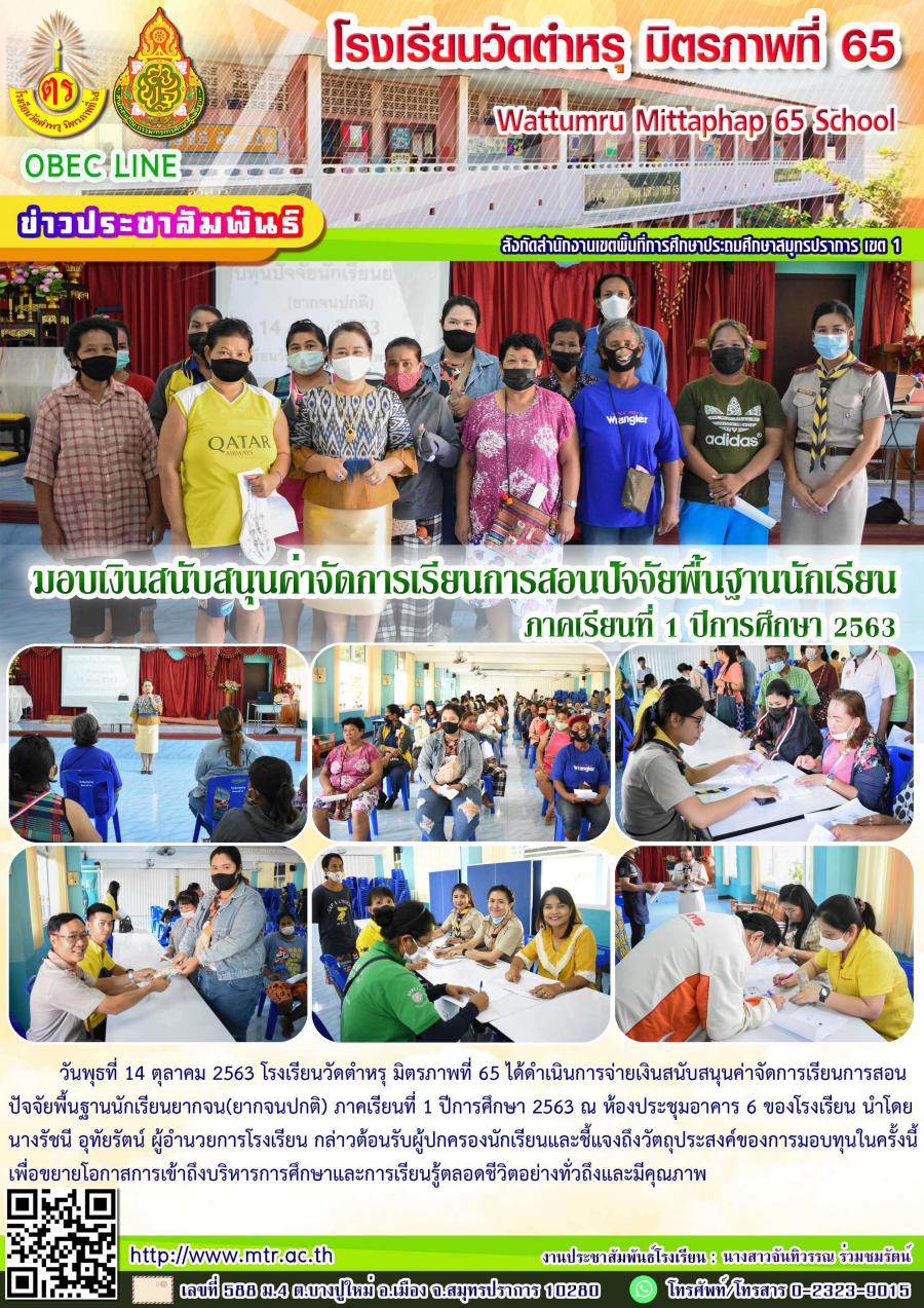 วันพุธที่ 14 ตุลาคม 2563 โรงเรียนวัดตำหรุ มิตรภาพที่ 65 ได้ดำเนินการจ่ายเงินสนับสนุนค่าจัดการเรียนการสอนปัจจัยพื้นฐานนักเรียนยากจน(ยากจนปกติ) ภาคเรียนที่ 1 ปีการศึกษา 2563 ณ ห้องประชุมอาคาร 6 ของโรงเรียน นำโดยนางรัชนี อุทัยรัตน์ ผู้อำนวยการโรงเรียน กล่าวต้อนรับผู้ปกครองนักเรียนและชี้แจงถึงวัตถุประสงค์ของการมอบทุนในครั้งนี้ เพื่อขยายโอกาสการเข้าถึงบริหารการศึกษาและการเรียนรู้ตลอดชีวิตอย่างทั่วถึงและมีคุณภาพ
