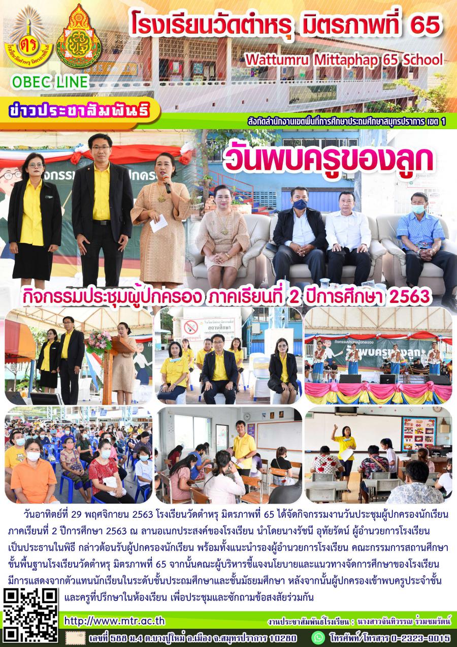 วันอาทิตย์ที่ 29 พฤศจิกายน 2563 โรงเรียนวัดตำหรุ มิตรภาพที่ 65 ได้จัดกิจกรรมงานวันประชุมผู้ปกครองนักเรียน ภาคเรียนที่ 2 ปีการศึกษา 2563 ณ ลานอเนกประสงค์ของโรงเรียน นำโดยนางรัชนี อุทัยรัตน์ ผู้อำนวยการโรงเรียน เป็นประธานในพิธี กล่าวต้อนรับผู้ปกครองนักเรียน พร้อมทั้งแนะนำรองผู้อำนวยการโรงเรียน คณะกรรมการสถานศึกษาขั้นพื้นฐานโรงเรียนวัดตำหรุ มิตรภาพที่ 65 จากนั้นคณะผู้บริหารชี้แจงนโยบายและแนวทางจัดการศึกษาของโรงเรียนมีการแสดงจากตัวแทนนักเรียนในระดับชั้นประถมศึกษาและชั้นมัธยมศึกษา หลังจากนั้นผู้ปกครองเข้าพบครูประจำชั้นและครูที่ปรึกษาในห้องเรียน เพื่อประชุมและซักถามข้อสงสัยร่วมกัน