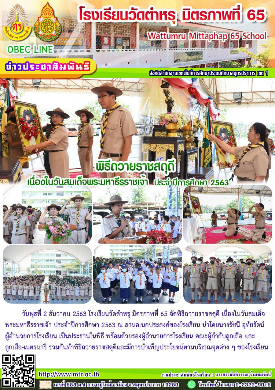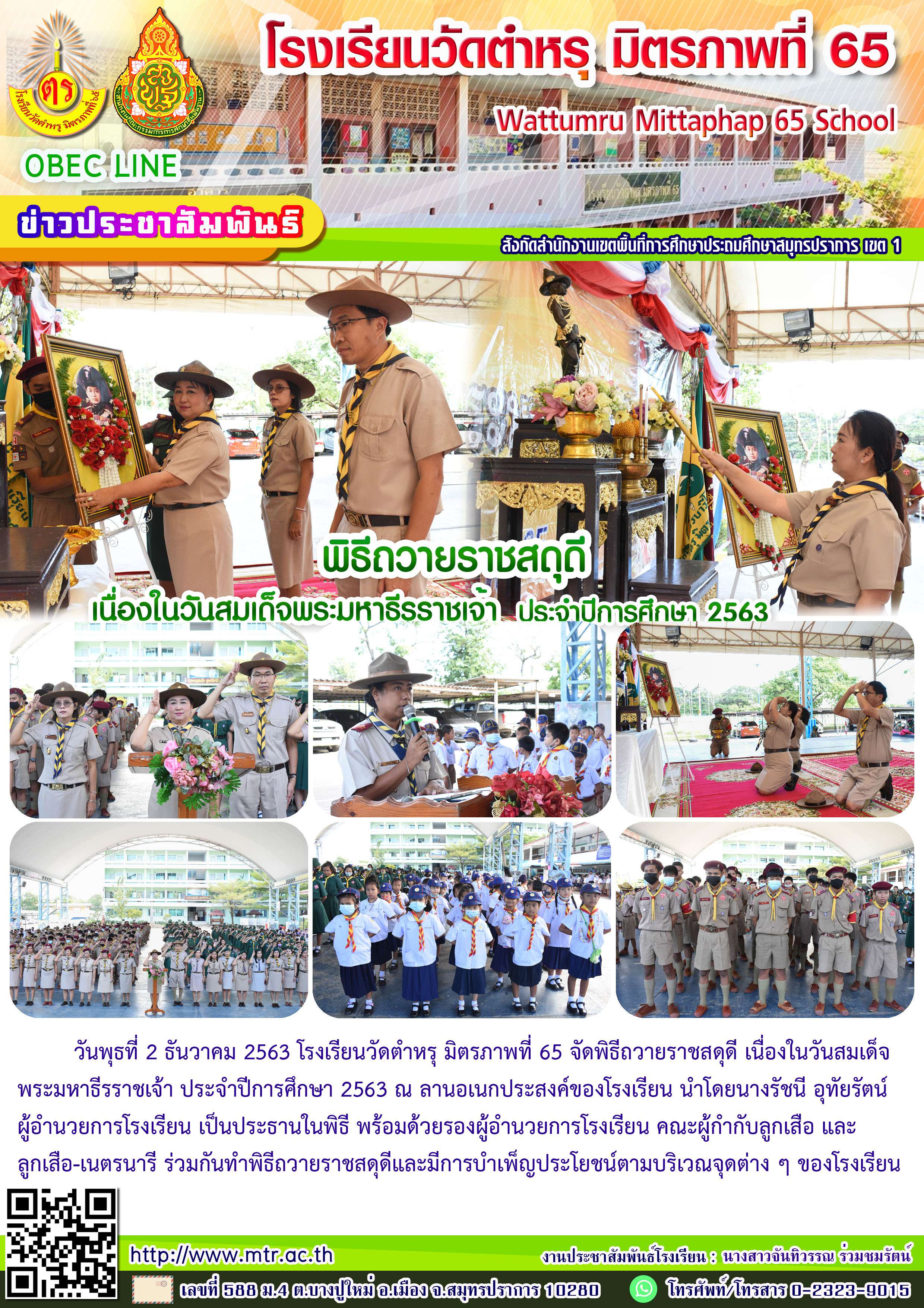 วันพุธที่ 2 ธันวาคม 2563 โรงเรียนวัดตำหรุ มิตรภาพที่ 65 จัดพิธีถวายราชสดุดี เนื่องในวันสมเด็จพระมหาธีรราชเจ้า ประจำปีการศึกษา 2563 ณ ลานอเนกประสงค์ของโรงเรียน นำโดยนางรัชนี อุทัยรัตน์ ผู้อำนวยการโรงเรียน เป็นประธานในพิธี พร้อมด้วยรองผู้อำนวยการโรงเรียน คณะผู้กำกับลูกเสือ และลูกเสือ-เนตรนารี ร่วมกันทำพิธีถวายราชสดุดีและมีการบำเพ็ญประโยชน์ตามบริเวณจุดต่าง ๆ ของโรงเรียน