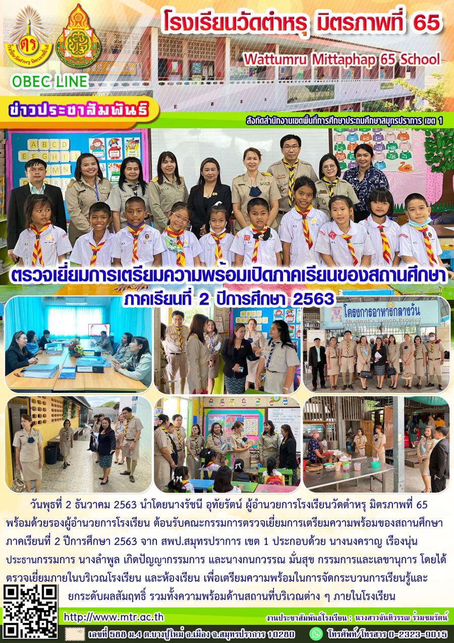 วันพุธที่ 2 ธันวาคม 2563 นำโดยนางรัชนี อุทัยรัตน์ ผู้อำนวยการโรงเรียนวัดตำหรุ มิตรภาพที่ 65 พร้อมด้วยรองผู้อำนวยการโรงเรียน ต้อนรับคณะกรรมการตรวจเยี่ยมการเตรียมความพร้อมของสถานศึกษา ภาคเรียนที่ 2 ปีการศึกษา 2563 จาก สพป.สมุทรปราการ เขต 1 ประกอบด้วย นางนงคราญ เรืองนุ่น ประธานกรรมการ นางลำพูล เกิดปัญญากรรมการ และนางกนกวรรณ มั่นสุข กรรมการและเลขานุการ โดยได้ตรวจเยี่ยมภายในบริเวณโรงเรียน และห้องเรียนเพื่อเตรียมความพร้อมในการจัดกระบวนการเรียนรู้และยกระดับผลสัมฤทธิ์ รวมทั้งความพร้อมด้านสถานที่บริเวณต่าง ๆ ภายในโรงเรียน
