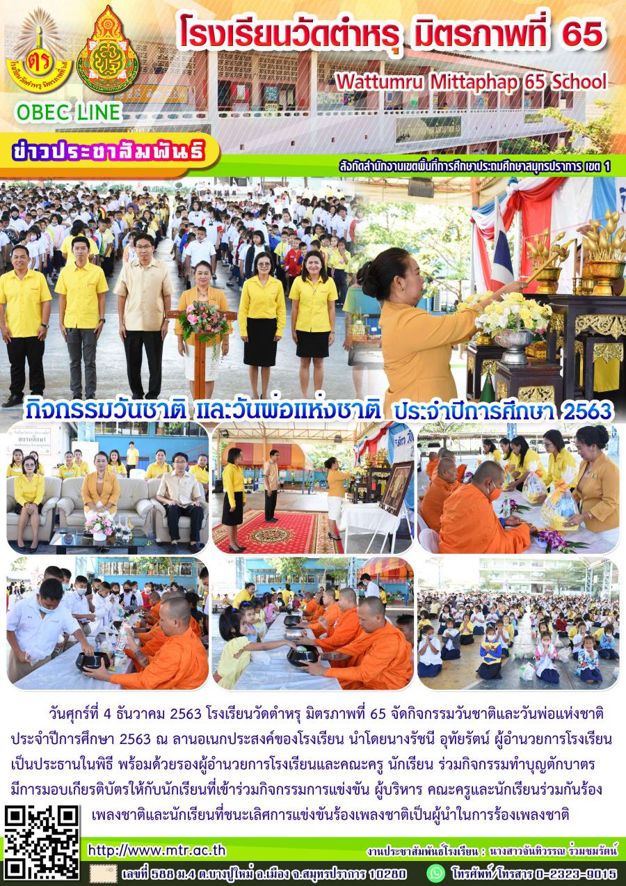 วันศุกร์ที่ 4 ธันวาคม 2563 โรงเรียนวัดตำหรุ มิตรภาพที่ 65 จัดกิจกรรมวันชาติและวันพ่อแห่งชาติ ประจำปีการศึกษา 2563 ณ ลานเนกประสงค์ของโรงเรียน นำโดยนางรัชนี อุทัยรัตน์ ผู้อำนวยการโรงเรียน เป็นประธานในพิธี พร้อมด้วยรองผู้อำนวยการโรงเรียนและคณะครู นักเรียน ร่วมกิจกรรมทำบุญตักบาตรมีการมอบเกียรติบัตรให้กับนักเรียนที่เข้าร่วมกิจกรรมการแข่งขัน ผู้บริหาร คณะครูและนักเรียนร่วมกันร้องเพลงชาติและนักเรียนที่ชนะเลิศการแข่งขันร้องเพลงชาติเป็นผู้นำในการร้องเพลงชาติ