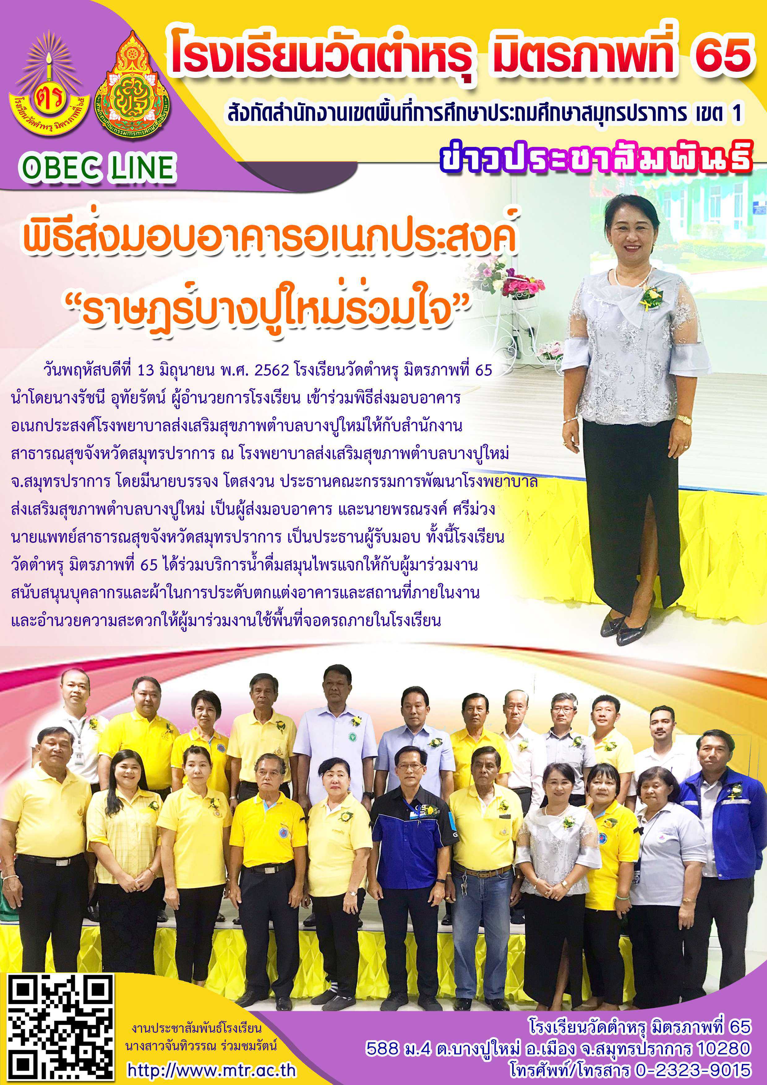วันพฤหัสบดีที่ 13 มิถุนายน พ.ศ. 2562 โรงเรียนวัดตำหรุ มิตรภาพที่ 65 นำโดยนางรัชนี อุทัยรัตน์ ผู้อำนวยการโรงเรียน เข้าร่วมพิธีส่งมอบอาคาร อเนกประสงค์โรงพยาบาลส่งเสริมสุขภาพตำบลบางปูใหม่ให้กับสำนักงาน สาธารณสุขจังหวัดสมุทรปราการ ณ โรงพยาบาลส่งเสริมสุขภาพตำบลบางปูใหม่ จ.สมุทรปราการ โดยมีนายบรรจง โตสงวน ประธานคณะกรรมการพัฒนาโรงพยาบาล ส่งเสริมสุขภาพตำบลบางปูใหม่ เป็นผู้ส่งมอบอาคาร และนายพรณรงค์ ศรีม่วง นายแพทย์สาธารณสุขจังหวัดสมุทรปราการ เป็นประธานผู้รับมอบ ทั้งนี้โรงเรียน วัดตำหรุ มิตรภาพที่ 65 ได้ร่วมบริการน้ำดื่มสมุนไพรแจกให้กับผู้มาร่วมงาน สนับสนุนบุคลากรและผ้าในการประดับตกแต่งอาคารและสถานที่ภายในงาน และอำนวยความสะดวกให้ผู้มาร่วมงานใช้พื้นที่จอดรถภายในโรงเรียน
