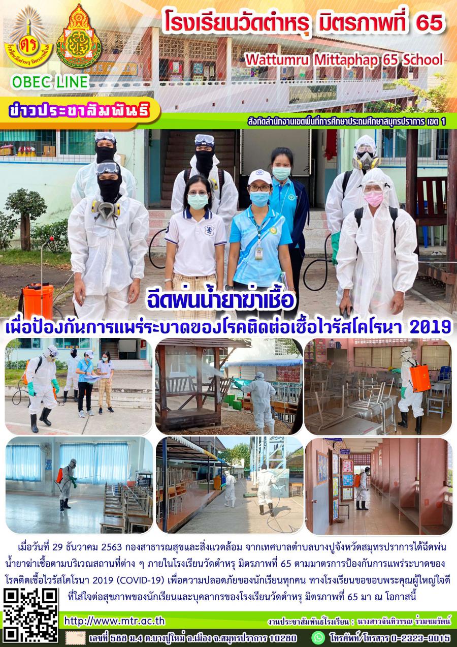 น้ำยาฆ่าเชื้อตามบริเวณสถานที่ต่าง ๆ ภายในโรงเรียนวัดตำหรุ มิตรภาพที่ 65 ตามมาตรการป้องกันการแพร่ระบาดของ