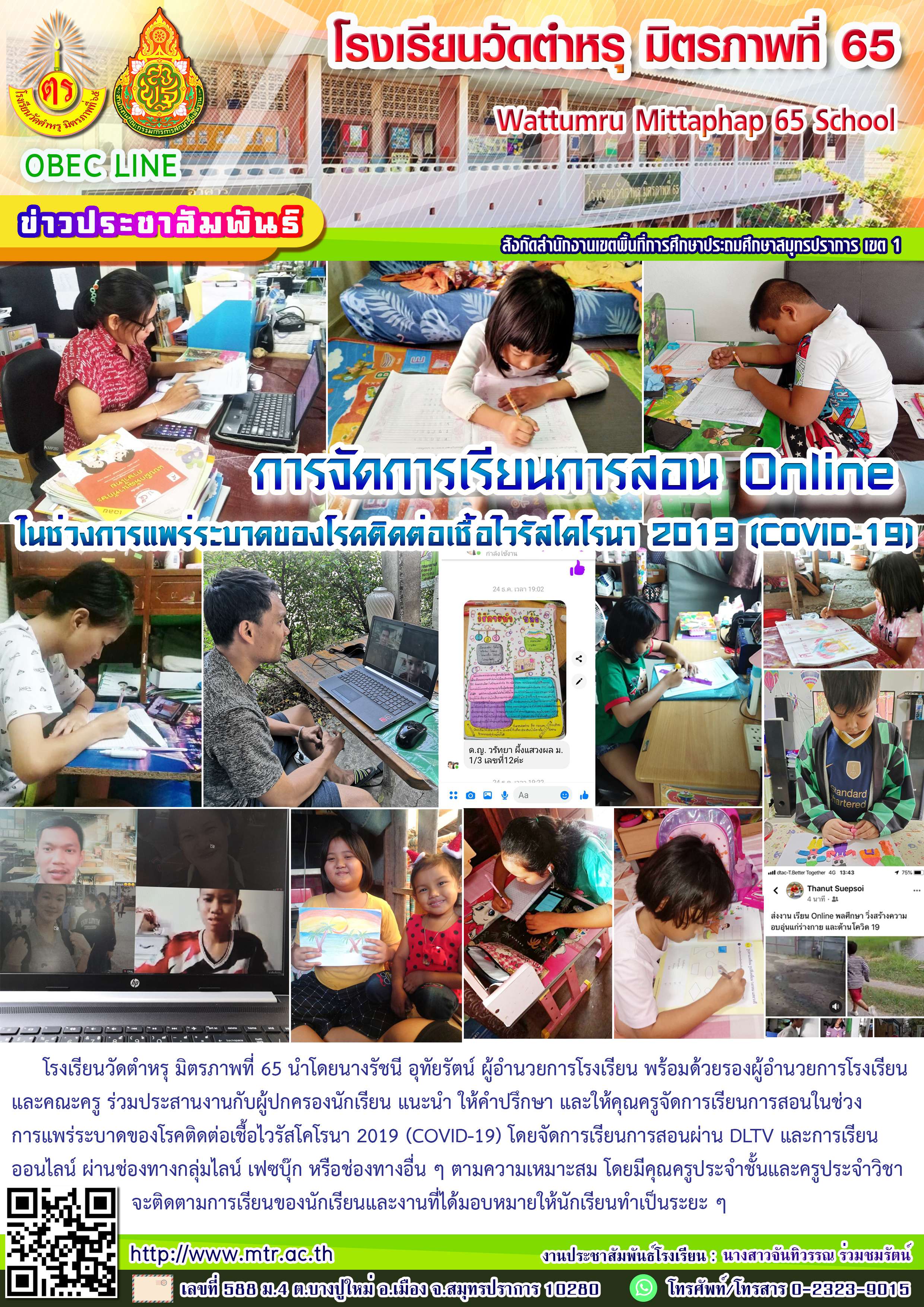 โรงเรียนวัดตำหรุ มิตรภาพที่ 65 นำโดยนางรัชนี อุทัยรัตน์ ผู้อำนวยการโรงเรียน พร้อมด้วยรองผู้อำนวยการโรงเรียน และคณะครู ร่วมประสานงานกับผู้ปกครองนักเรียน แนะนำ ให้คำปรึกษา และให้คุณครูจัดการเรียนการสอนในช่วงการแพร่ระบาดของโรคติดต่อเชื้อไวรัสโคโรนา 2019 (COVID-19) โดยจัดการเรียนการสอนผ่าน DLTV และการเรียนออนไลน์ ผ่านช่องทางกลุ่มไลน์ เฟซบุ๊ก หรือช่องทางอื่น ๆ ตามความเหมาะสม โดยมีคุณครูประจำชั้นและครูประจำวิชาจะติดตามการเรียนของนักเรียนและงานที่ได้มอบหมายให้นักเรียนทำเป็นระยะ ๆ