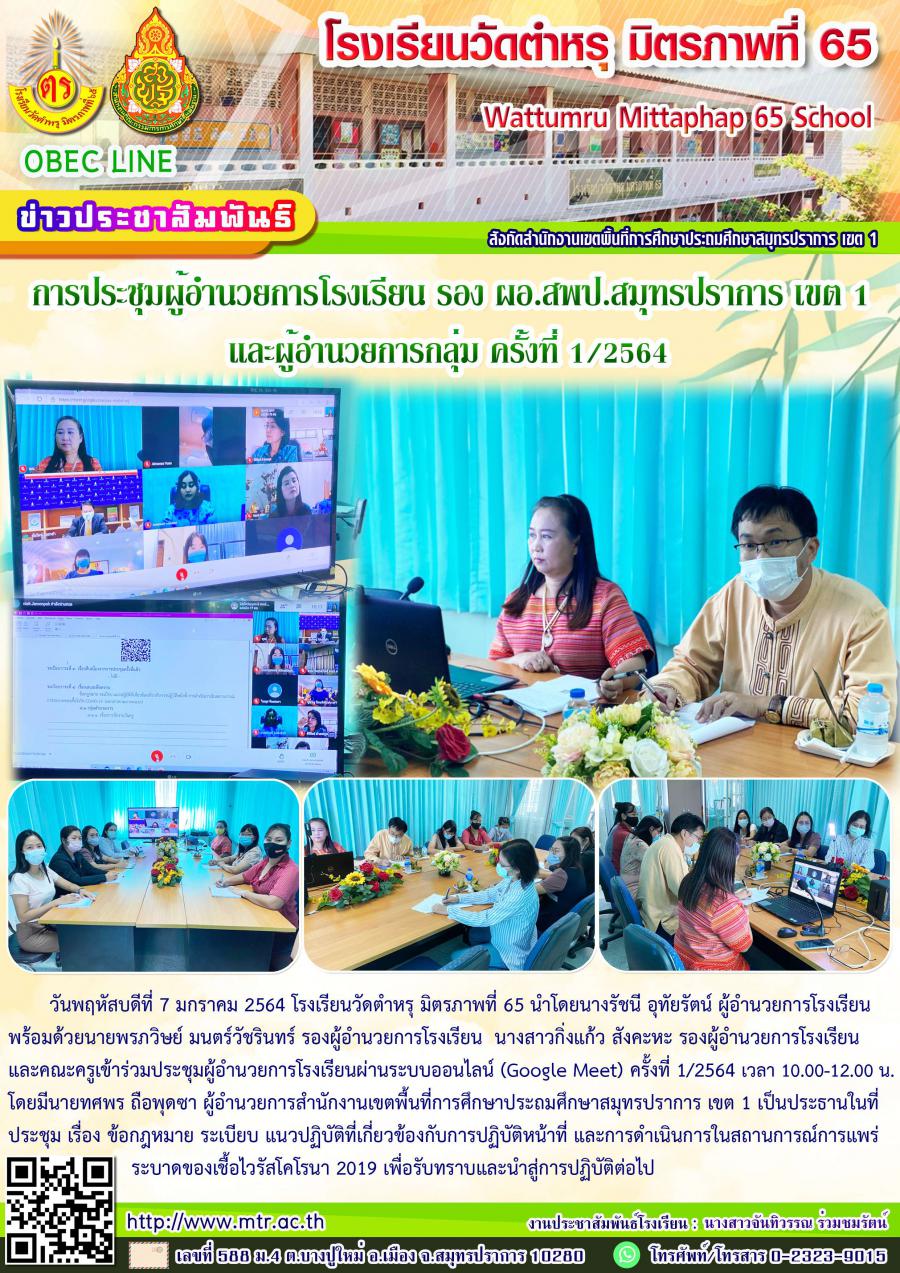 วันพฤหัสบดีที่ 7 มกราคม 2564 โรงเรียนวัดตำหรุ มิตรภาพที่ 65 นำโดยนางรัชนี อุทัยรัตน์ ผู้อำนวยการโรงเรียน พร้อมด้วยนายพรภวิษย์ มนตร์วัชรินทร์ รองผู้อำนวยการโรงเรียน นางสาวกิ่งแก้ว สังคะหะ รองผู้อำนวยการโรงเรียนและคณะครูเข้าร่วมประชุมผู้อำนวยการโรงเรียนผ่านระบบออนไลน์ (Google Meet) ครั้งที่ 1/2564 เวลา 10.00-12.00 น. โดยมีนายทศพร ถือพุดซา ผู้อำนวยการสำนักงานเขตพื้นที่การศึกษาประถมศึกษาสมุทรปราการ เขต 1 เป็นประธานในที่ประชุม เรื่อง ข้อกฎหมาย ระเบียบ แนวปฏิบัติที่เกี่ยวข้องกับการปฏิบัติหน้าที่ และการดำเนินการในสถานการณ์การแพร่ระบาดของเชื้อไวรัสโคโรนา 2019 เพื่อรับทราบและนำสู่การปฏิบัติต่อไป