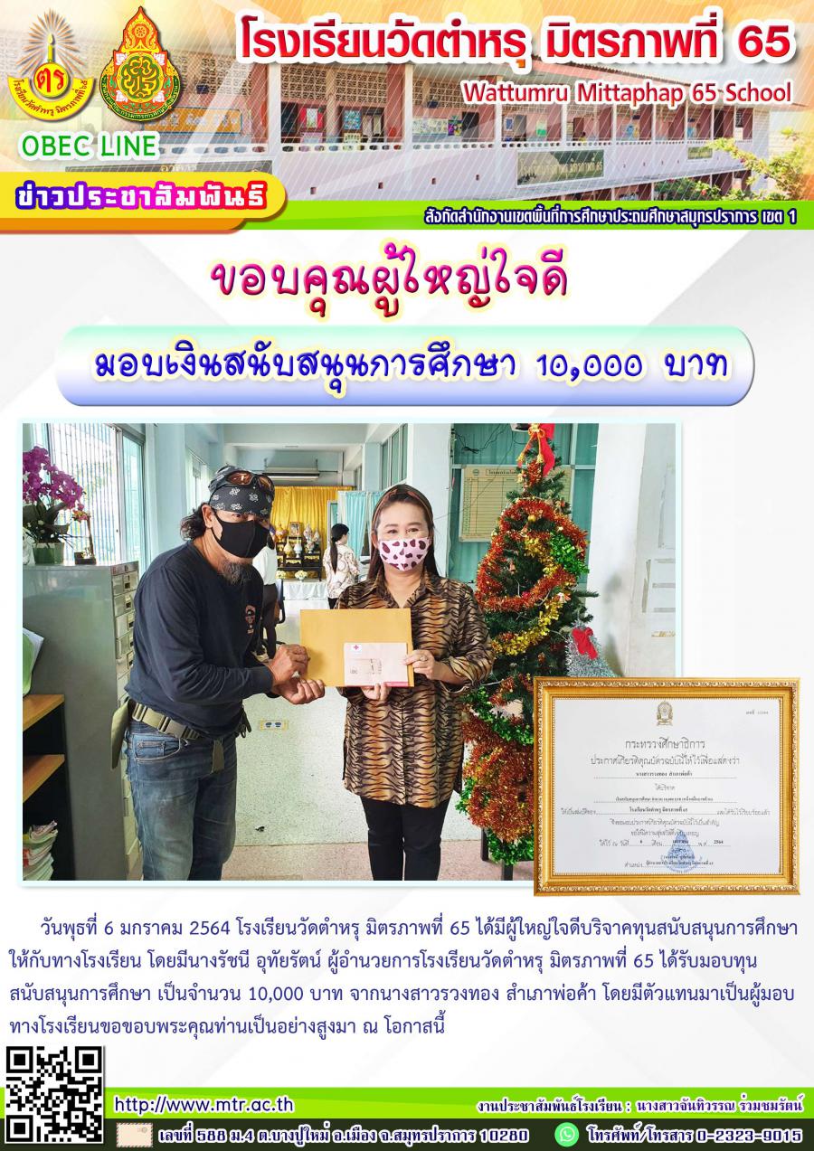 วันพุธที่ 6 มกราคม 2564 โรงเรียนวัดตำหรุ มิตรภาพที่ 65 ได้มีผู้ใหญ่ใจดีบริจาคทุนสนับสนุนการศึกษาให้กับทางโรงเรียน โดยมีนางรัชนี อุทัยรัตน์ ผู้อำนวยการโรงเรียนวัดตำหรุ มิตรภาพที่ 65 ได้รับมอบทุนสนับสนุนการศึกษา เป็นจำนวน 10,000 บาท จากนางสาวรวงทอง สำเภาพ่อค้า โดยมีตัวแทนมาเป็นผู้มอบทางโรงเรียนขอขอบพระคุณท่านเป็นอย่างสูงมา ณ โอกาสนี้