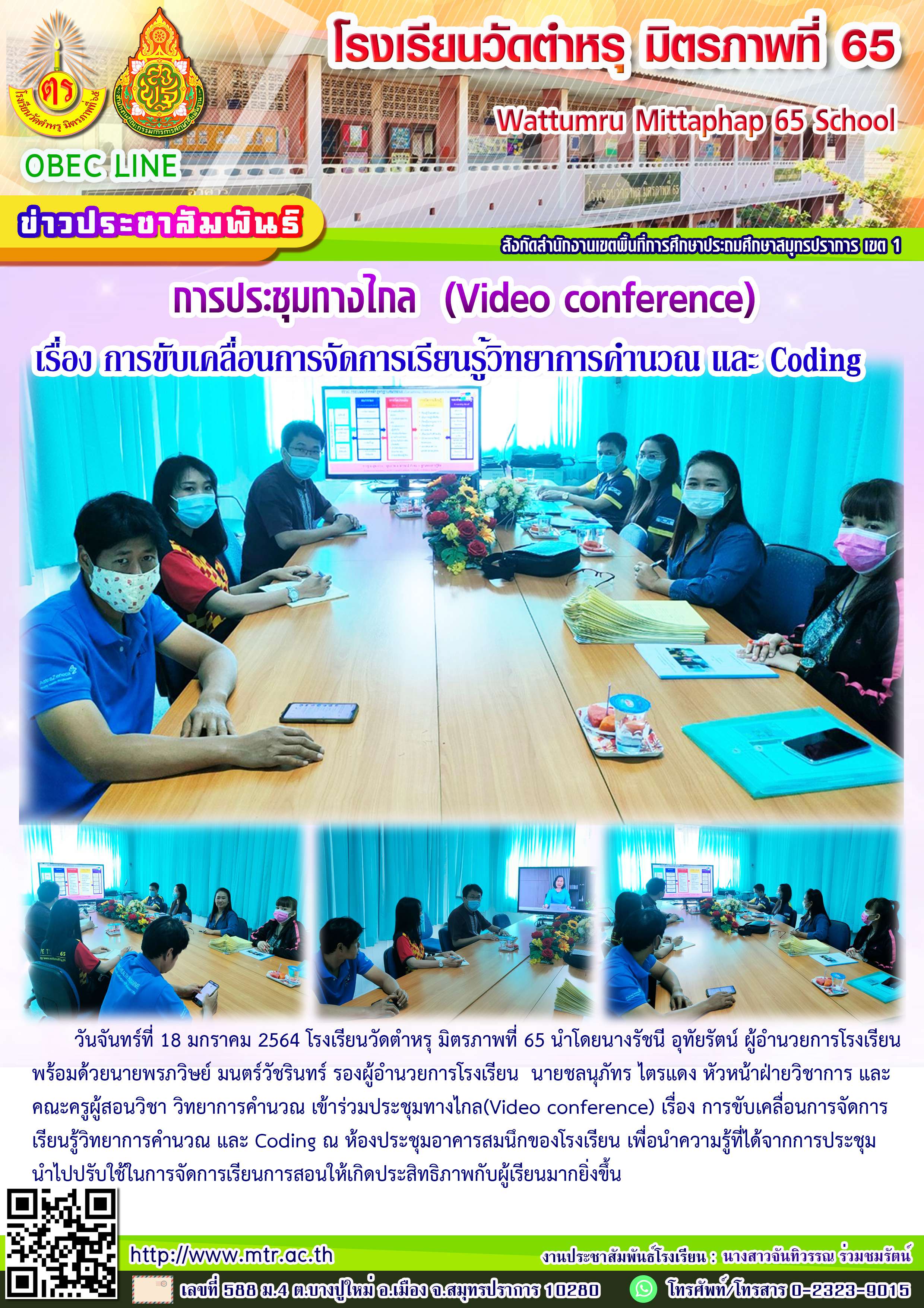 วันจันทร์ที่ 18 มกราคม 2564 โรงเรียนวัดตำหรุ มิตรภาพที่ 65 นำโดยนางรัชนี อุทัยรัตน์ ผู้อำนวยการโรงเรียน พร้อมด้วยนายพรภวิษย์ มนตร์วัชรินทร์ รองผู้อำนวยการโรงเรียน นายชลนุภัทร ไตรแดง หัวหน้าฝ่ายวิชาการ และคณะครูผู้สอนวิชา วิทยาการคำนวณ เข้าร่วมประชุมทางไกล(Video conference) เรื่อง การขับเคลื่อนการจัดการเรียนรู้วิทยาการคำนวณ และ Coding ณ ห้องประชุมอาคารสมนึกของโรงเรียน เพื่อนำความรู้ที่ได้จากการประชุม นำไปปรับใช้ในการจัดการเรียนการสอนให้เกิดประสิทธิภาพกับผู้เรียนมากยิ่งขึ้น