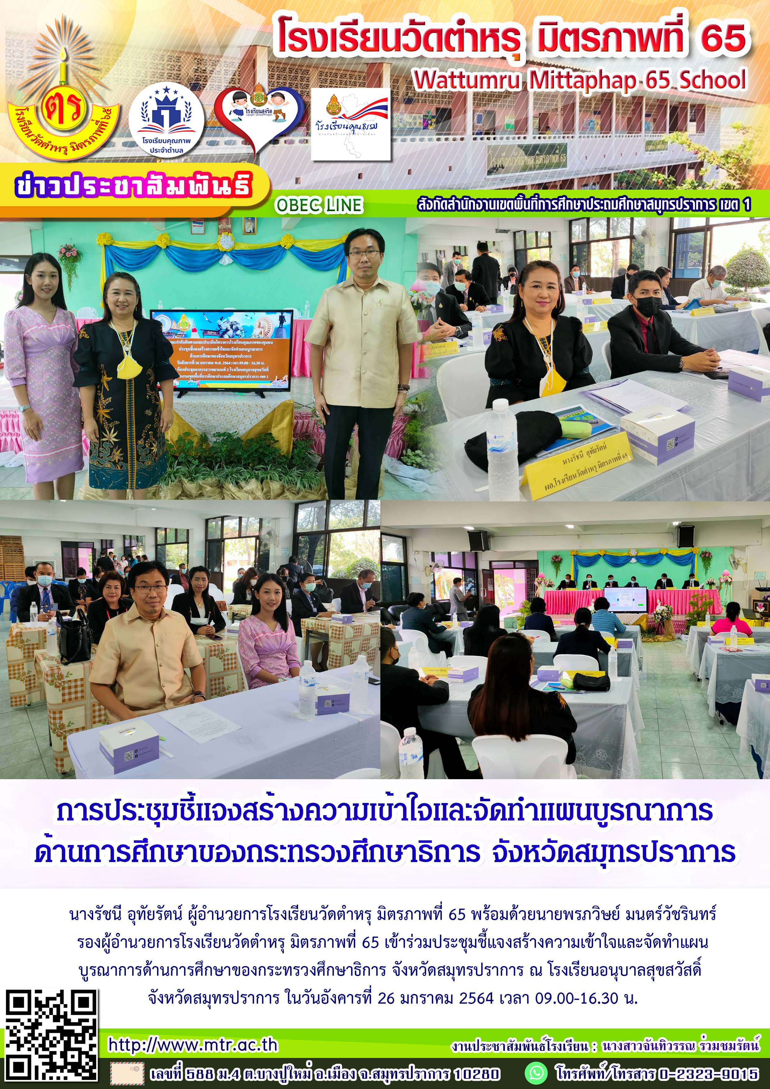 นางรัชนี อุทัยรัตน์ ผู้อำนวยการโรงเรียนวัดตำหรุ มิตรภาพที่ 65 พร้อมด้วยนายพรภวิษย์ มนตร์วัชรินทร์ รองผู้อำนวยการโรงเรียนวัดตำหรุ มิตรภาพที่ 65 เข้าร่วมประชุมชี้แจงสร้างความเข้าใจและจัดทำแผนบูรณาการด้านการศึกษาของกระทรวงศึกษาธิการ จังหวัดสมุทรปราการ ณ โรงเรียนอนุบาลสุขสวัสดิ์ จังหวัดสมุทรปราการ ในวันอังคารที่ 26 มกราคม 2564 เวลา 09.00-16.30 น.