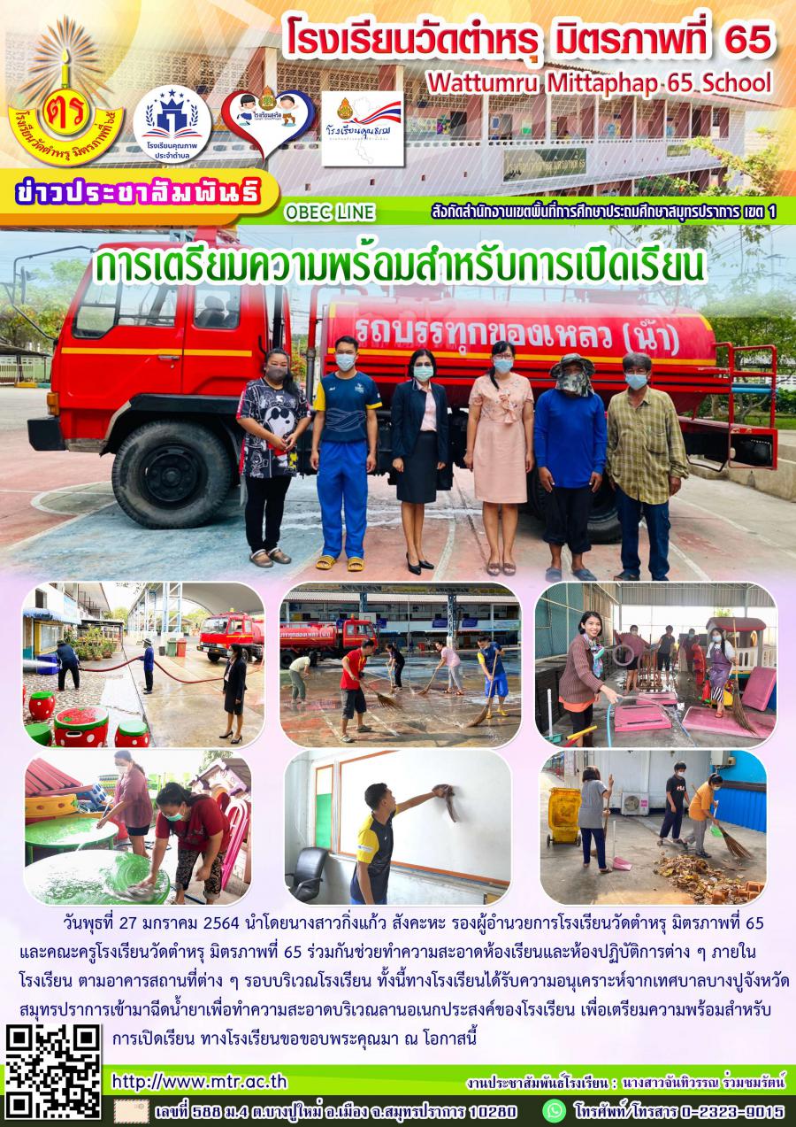 วันพุธที่ 27 มกราคม 2564 นำโดยนางสาวกิ่งแก้ว สังคะหะ รองผู้อำนวยการโรงเรียนวัดตำหรุ มิตรภาพที่ 65 และคณะครูโรงเรียนวัดตำหรุ มิตรภาพที่ 65 ร่วมกันช่วยทำความสะอาดห้องเรียนและห้องปฏิบัติการต่าง ๆ ภายในโรงเรียน ตามอาคารสถานที่ต่าง ๆ รอบบริเวณโรงเรียน ทั้งนี้ทางโรงเรียนได้รับความอนุเคราะห์จากเทศบาลบางปูจังหวัดสมุทรปราการเข้ามาฉีดน้ำยาเพื่อทำความสะอาดบริเวณลานอเนกประสงค์ของโรงเรียน เพื่อเตรียมความพร้อมสำหรับการเปิดเรียน ทางโรงเรียนขอขอบพระคุณมา ณ โอกาสนี้