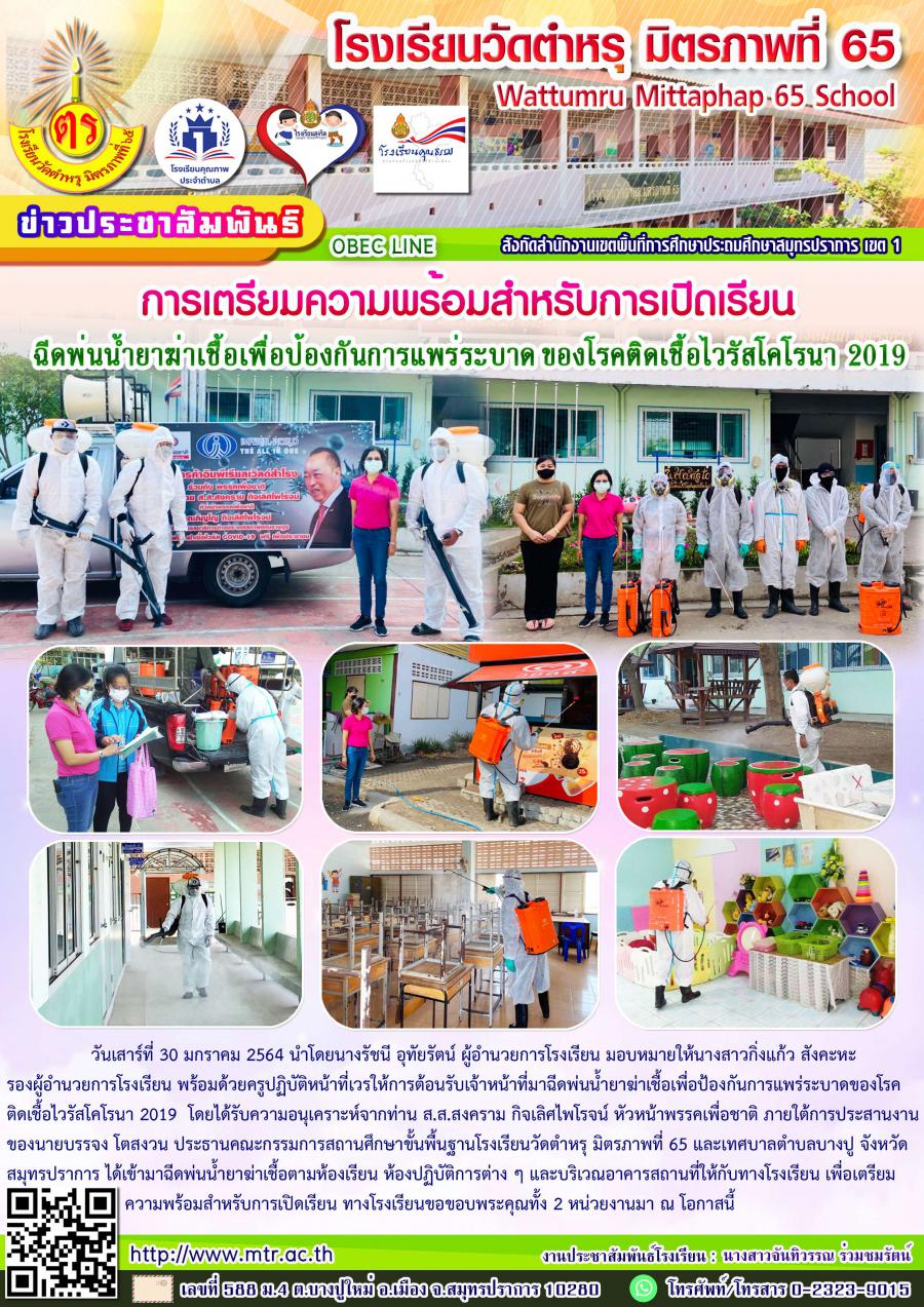 วันเสาร์ที่ 30 มกราคม 2564 นำโดยนางรัชนี อุทัยรัตน์ ผู้อำนวยการโรงเรียน มอบหมายให้นางสาวกิ่งแก้ว สังคะหะ รองผู้อำนวยการโรงเรียน พร้อมด้วยครูปฏิบัติหน้าที่เวรให้การต้อนรับเจ้าหน้าที่มาฉีดพ่นน้ำยาฆ่าเชื้อเพื่อป้องกันการแพร่ระบาดของโรคติดเชื้อไวรัสโคโรนา 2019 โดยได้รับความอนุเคราะห์จากท่าน ส.ส.สงคราม กิจเลิศไพโรจน์ หัวหน้าพรรคเพื่อชาติ ภายใต้การประสานงานของนายบรรจง โตสงวน ประธานคณะกรรมการสถานศึกษาขั้นพื้นฐานโรงเรียนวัดตำหรุ มิตรภาพที่ 65 และเทศบาลตำบลบางปู จังหวัดสมุทรปราการ ได้เข้ามาฉีดพ่นน้ำยาฆ่าเชื้อตามห้องเรียน ห้องปฏิบัติการต่าง ๆ และบริเวณอาคารสถานที่ให้กับทางโรงเรียน เพื่อเตรียมความพร้อมสำหรับการเปิดเรียน ทางโรงเรียนขอขอบพระคุณทั้ง 2 หน่วยงานมา ณ โอกาสนี้