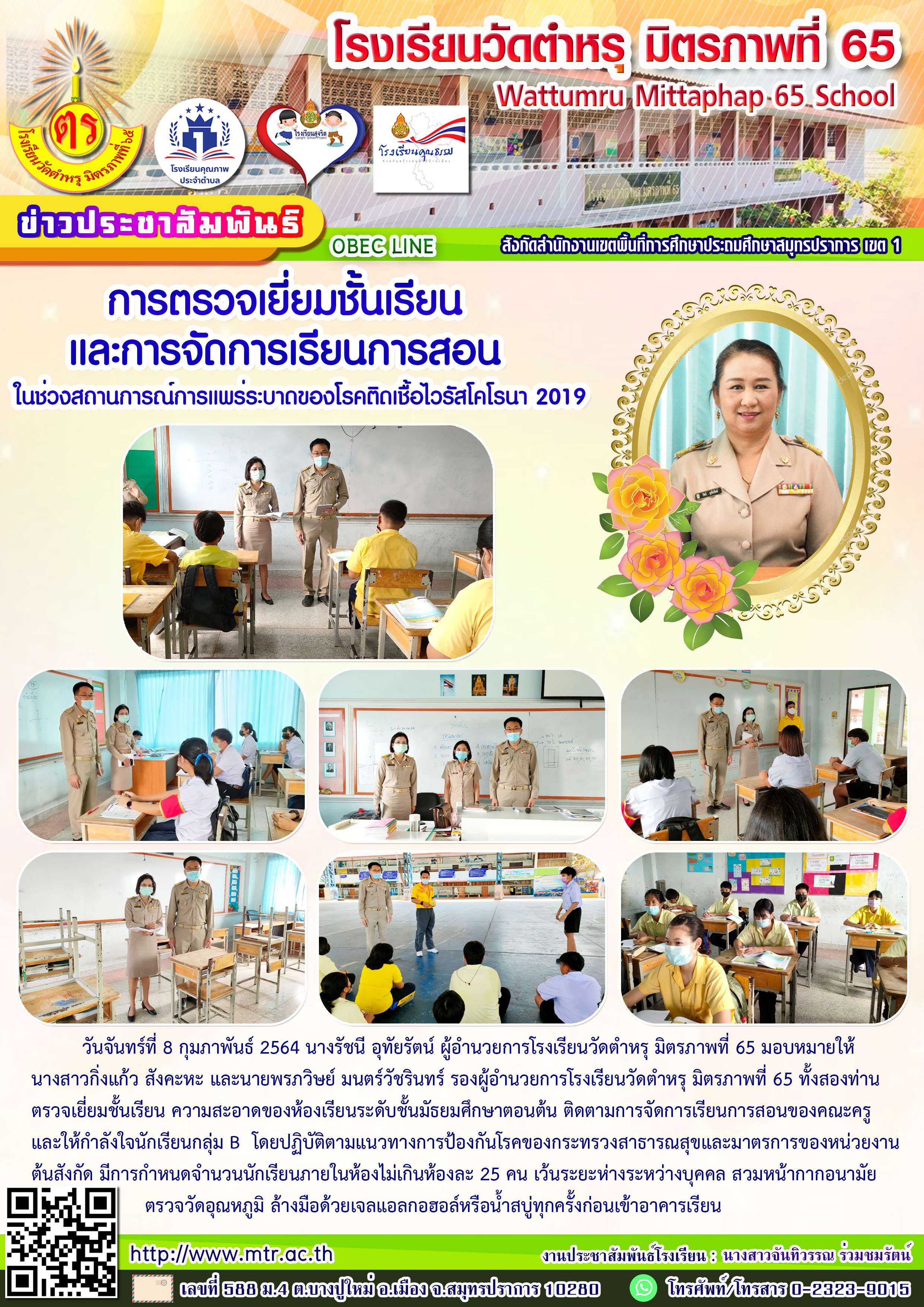 วันจันทร์ที่ 8 กุมภาพันธ์ 2564 นางรัชนี อุทัยรัตน์ ผู้อำนวยการโรงเรียนวัดตำหรุ มิตรภาพที่ 65 มอบหมายให้นางสาวกิ่งแก้ว สังคะหะ และนายพรภวิษย์ มนตร์วัชรินทร์ รองผู้อำนวยการโรงเรียนวัดตำหรุ มิตรภาพที่ 65 ทั้งสองท่าน ตรวจเยี่ยมชั้นเรียน ความสะอาดของห้องเรียนระดับชั้นมัธยมศึกษาตอนต้น ติดตามการจัดการเรียนการสอนของคณะครู และให้กำลังใจนักเรียนกลุ่ม B โดยปฏิบัติตามแนวทางการป้องกันโรคของกระทรวงสาธารณสุขและมาตรการของหน่วยงานต้นสังกัด มีการกำหนดจำนวนนักเรียนภายในห้องไม่เกินห้องละ 25 คน เว้นระยะห่างระหว่างบุคคล สวมหน้ากากอนามัยตรวจวัดอุณหภูมิ ล้างมือด้วยเจลแอลกอฮอล์หรือน้ำสบู่ทุกครั้งก่อนเข้าอาคารเรียน
