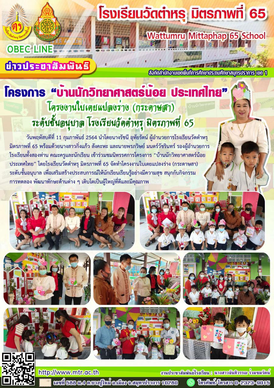 วันพฤหัสบดีที่ 11 กุมภาพันธ์ 2564 นำโดยนางรัชนี อุทัยรัตน์ ผู้อำนวยการโรงเรียนวัดตำหรุ มิตรภาพที่ 65 พร้อมด้วยนางสาวกิ่งแก้ว สังคะหะ และนายพรภวิษย์ มนตร์วัชรินทร์ รองผู้อำนวยการโรงเรียนทั้งสองท่าน คณะครูและนักเรียน เข้าร่วมชมนิทรรศการโครงการ “บ้านนักวิทยาศาสตร์น้อย ประเทศไทย” โดยโรงเรียนวัดตำหรุ มิตรภาพที่ 65 จัดทำโครงงานใบเตยแปลงร่าง (กระดาษสา) ระดับชั้นอนุบาล เพื่อเสริมสร้างประสบการณ์ให้นักเรียนเรียนรู้อย่างมีความสุข สนุกกับกิจกรรมการทดลอง พัฒนาทักษะด้านต่าง ๆ เติบโตเป็นผู้ใหญ่ที่ดีและมีคุณภาพ