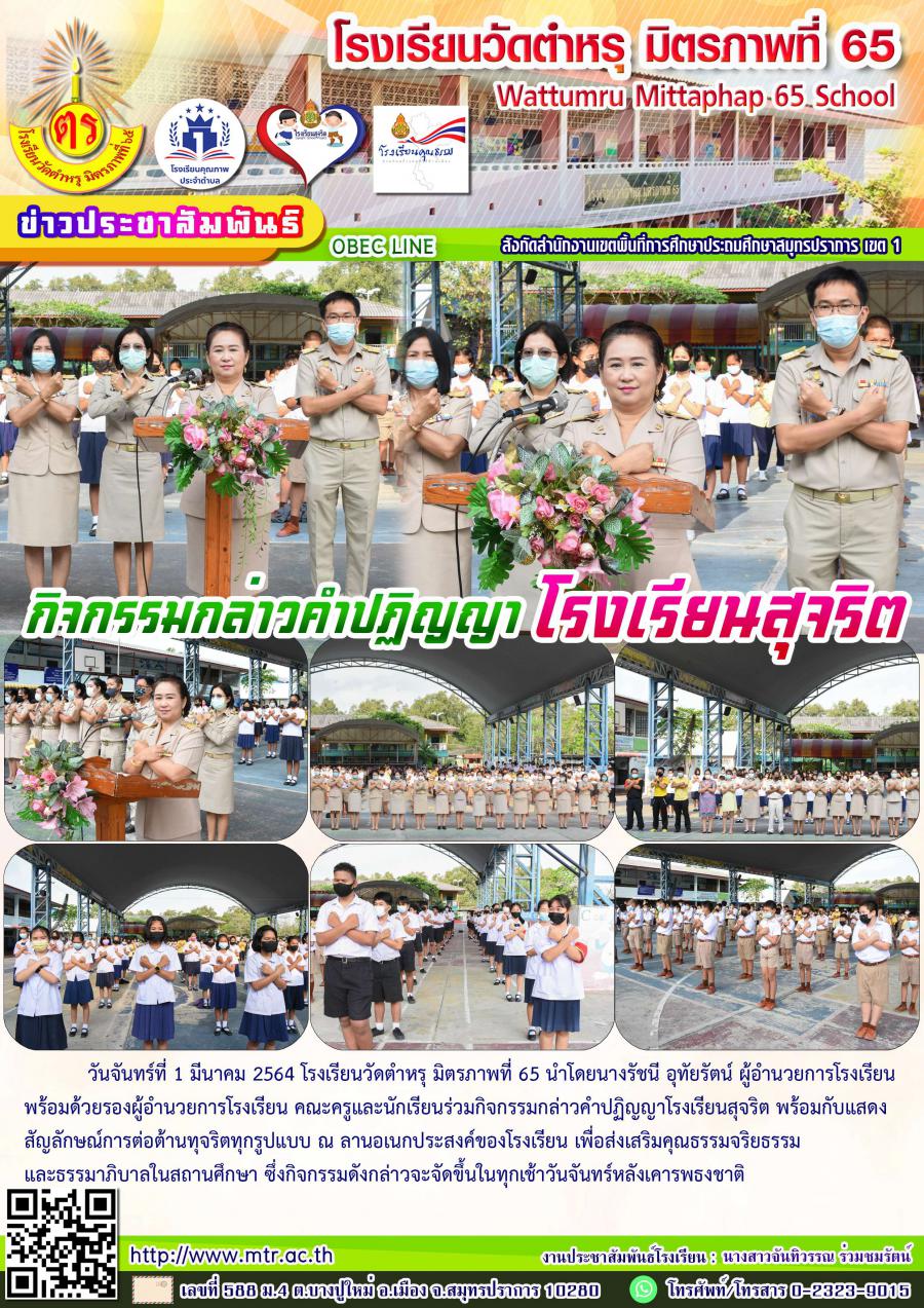 วันจันทร์ที่ 1 มีนาคม 2564 โรงเรียนวัดตำหรุ มิตรภาพที่ 65 นำโดยนางรัชนี อุทัยรัตน์ ผู้อำนวยการโรงเรียน พร้อมด้วยรองผู้อำนวยการโรงเรียน คณะครูและนักเรียน ร่วมกิจกรรมกล่าวคำปฏิญญาโรงเรียนสุจริต พร้อมกับแสดงสัญลักษณ์การต่อต้านทุจริตทุกรูปแบบ ณ ลานอเนกประสงค์ของโรงเรียน เพื่อส่งเสริมคุณธรรมจริยธรรมและธรรมาภิบาลในสถานศึกษา ซึ่งกิจกรรมดังกล่าวจะจัดขึ้น ในทุกเช้าวันจันทร์หลังเคารพธงชาติ