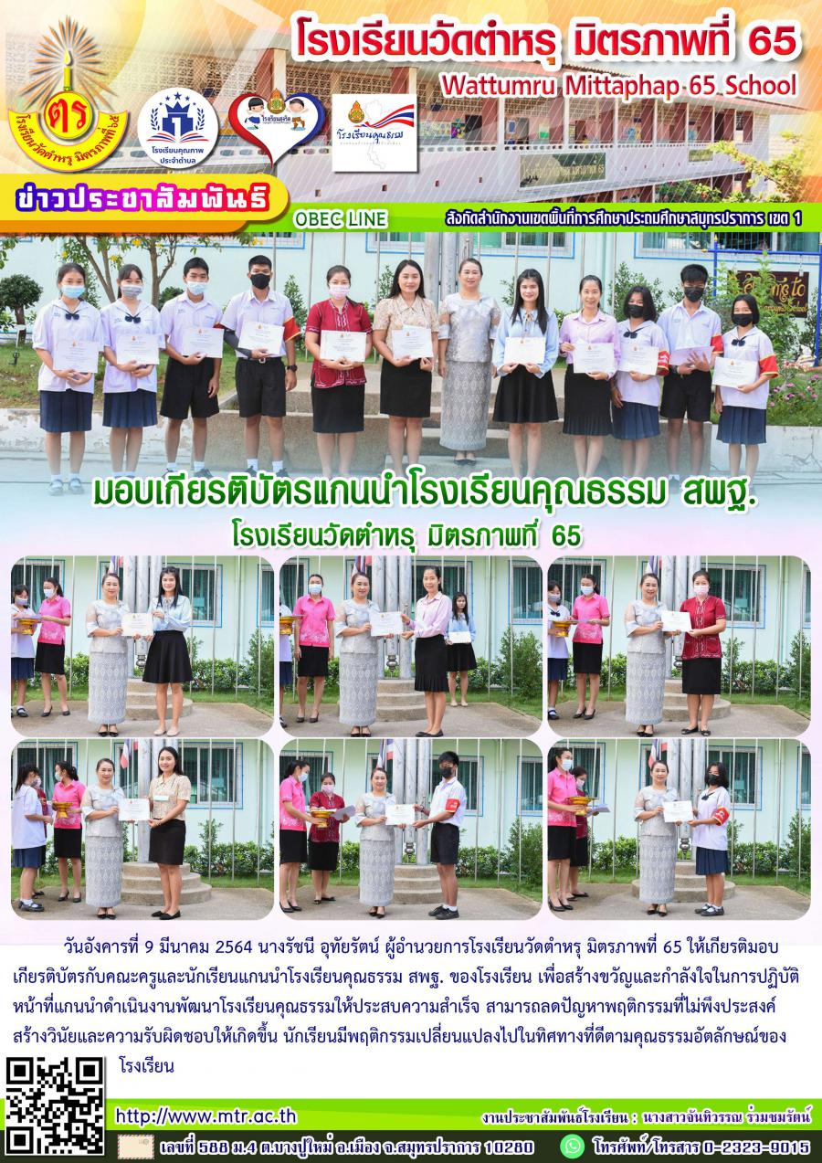 วันอังคารที่ 9 มีนาคม 2564 นางรัชนี อุทัยรัตน์ ผู้อำนวยการโรงเรียนวัดตำหรุ มิตรภาพที่ 65 ให้เกียรติมอบเกียรติบัตรกับคณะครูและนักเรียนแกนนำโรงเรียนคุณธรรม สพฐ. ของโรงเรียน เพื่อสร้างขวัญและกำลังใจในการปฏิบัติหน้าที่แกนนำดำเนินงานพัฒนาโรงเรียนคุณธรรมให้ประสบความสำเร็จ สามารถลดปัญหาพฤติกรรมที่ไม่พึงประสงค์ สร้างวินัยและความรับผิดชอบให้เกิดขึ้น นักเรียนมีพฤติกรรมเปลี่ยนแปลงไปในทิศทางที่ดีตามคุณธรรมอัตลักษณ์ของโรงเรียน