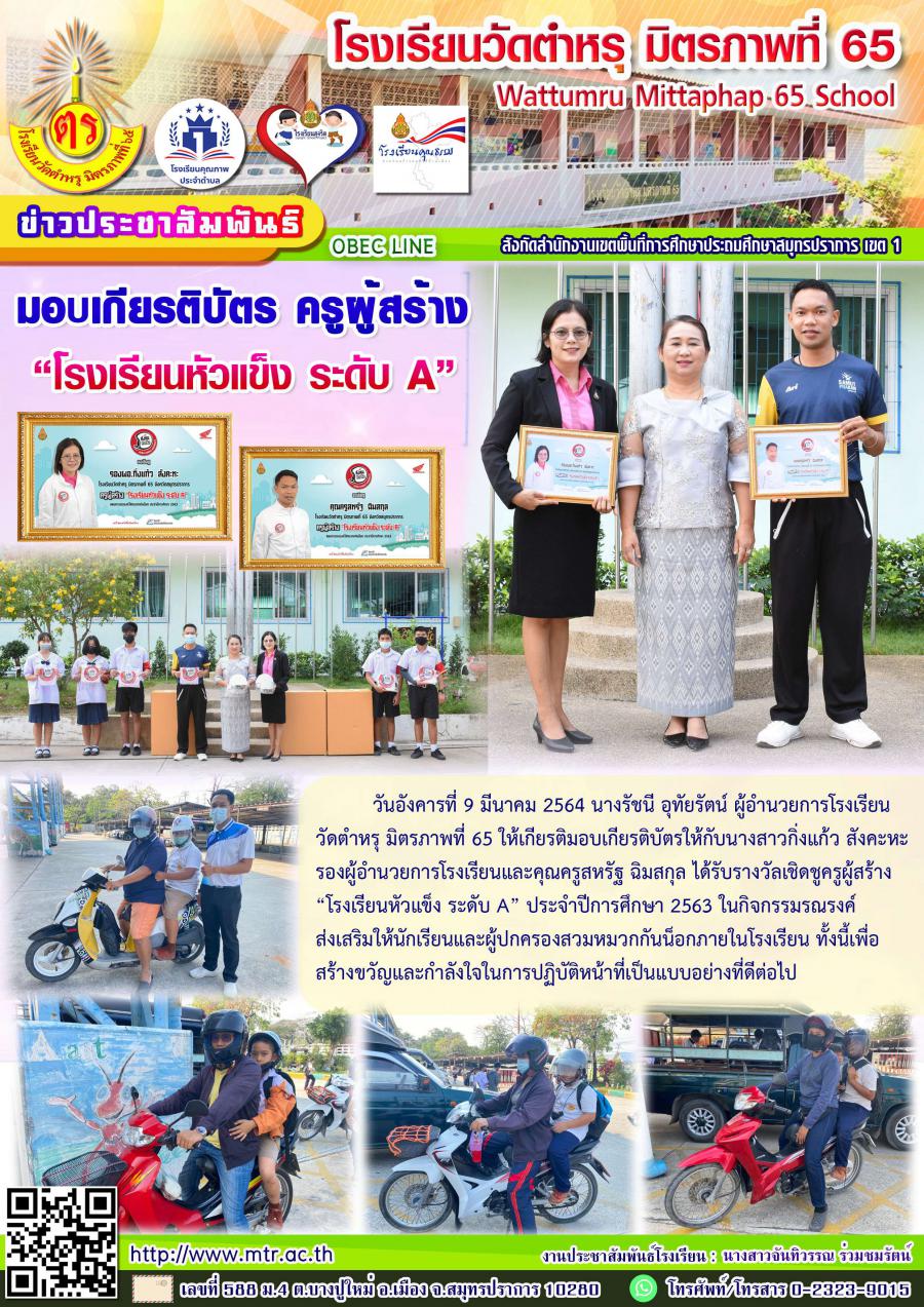 วันอังคารที่ 9 มีนาคม 2564 นางรัชนี อุทัยรัตน์ ผู้อำนวยการโรงเรียนวัดตำหรุ มิตรภาพที่ 65 ให้เกียรติมอบเกียรติบัตรให้กับนางสาวกิ่งแก้ว สังคะหะ รองผู้อำนวยการโรงเรียนและคุณครูสหรัฐ ฉิมสกุล ได้รับรางวัลเชิดชูครูผู้สร้าง “โรงเรียนหัวแข็ง ระดับ A” ประจำปีการศึกษา 2563 ในกิจกรรมรณรงค์ ส่งเสริมให้นักเรียนและผู้ปกครองสวมหมวกกันน็อกภายในโรงเรียน ทั้งนี้เพื่อสร้างขวัญและกำลังใจในการปฏิบัติหน้าที่เป็นแบบอย่างที่ดีต่อไป