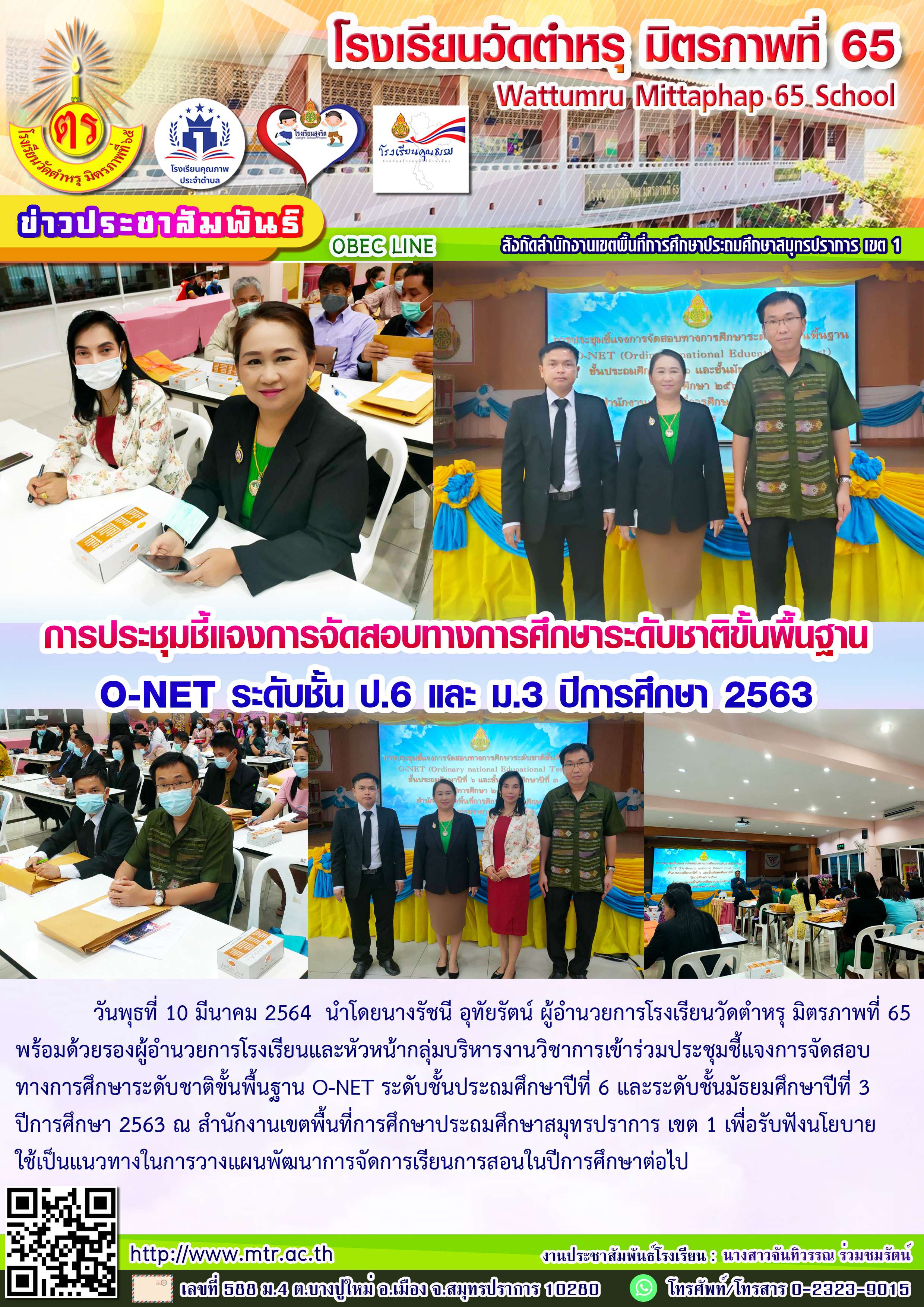 วันพุธที่ 10 มีนาคม 2564 นำโดยนางรัชนี อุทัยรัตน์ ผู้อำนวยการโรงเรียนวัดตำหรุ มิตรภาพที่ 65 พร้อมด้วยรองผู้อำนวยการโรงเรียนและหัวหน้ากลุ่มบริหารงานวิชาการเข้าร่วมประชุมชี้แจงการจัดสอบทางการศึกษาระดับชาติขั้นพื้นฐาน O-NET ระดับชั้นประถมศึกษาปีที่ 6 และระดับชั้นมัธยมศึกษาปีที่ 3 ปีการศึกษา 2563 ณ สำนักงานเขตพื้นที่การศึกษาประถมศึกษาสมุทรปราการ เขต 1 เพื่อรับฟังนโยบายใช้เป็นแนวทางในการวางแผนพัฒนาการจัดการเรียนการสอนในปีการศึกษาต่อไป