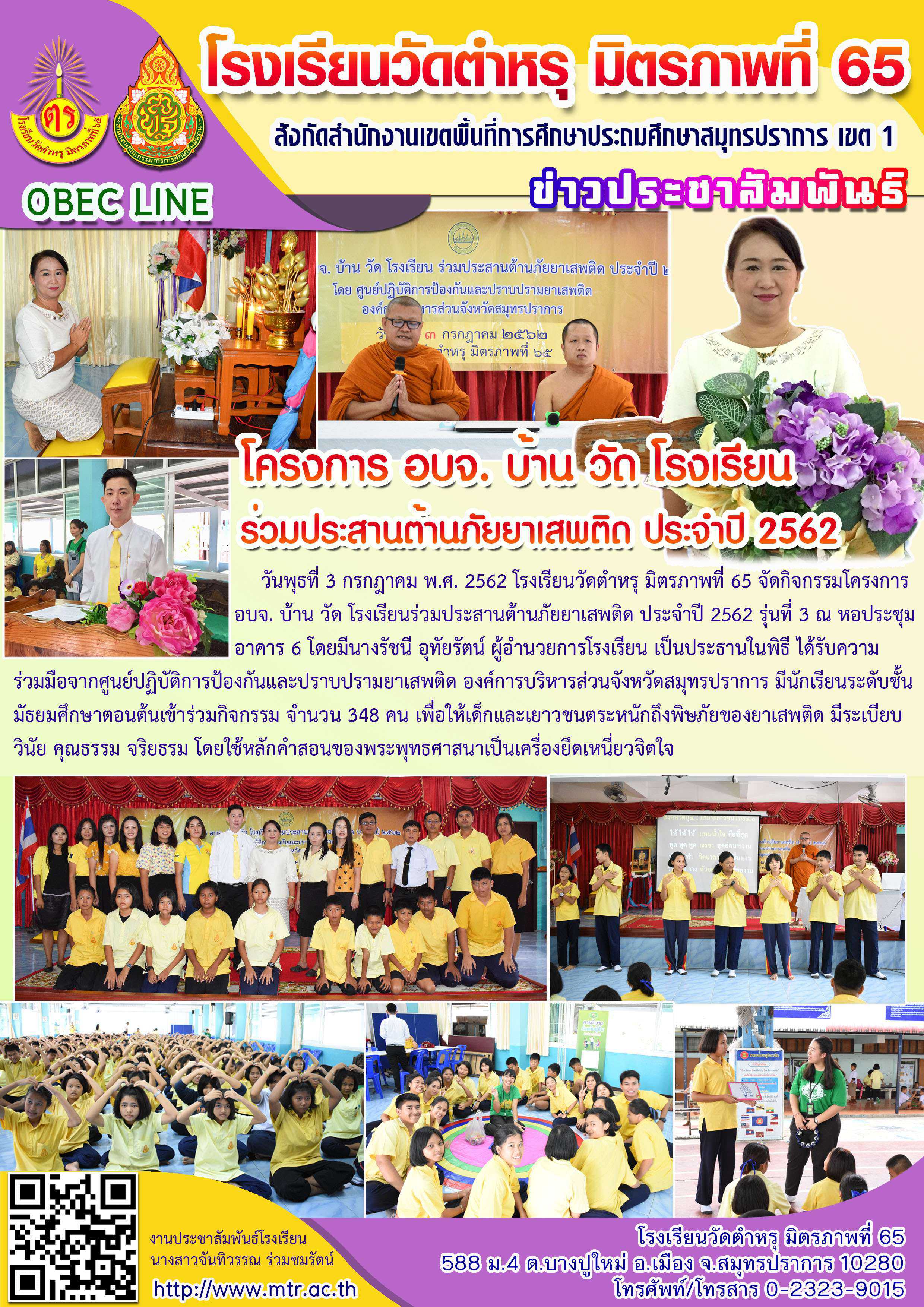 โครงการ อบจ. บ้าน วัด โรงเรียนร่วมประสานต้านภัยยาเสพติด ประจำปี 2562 รุ่นที่ 3