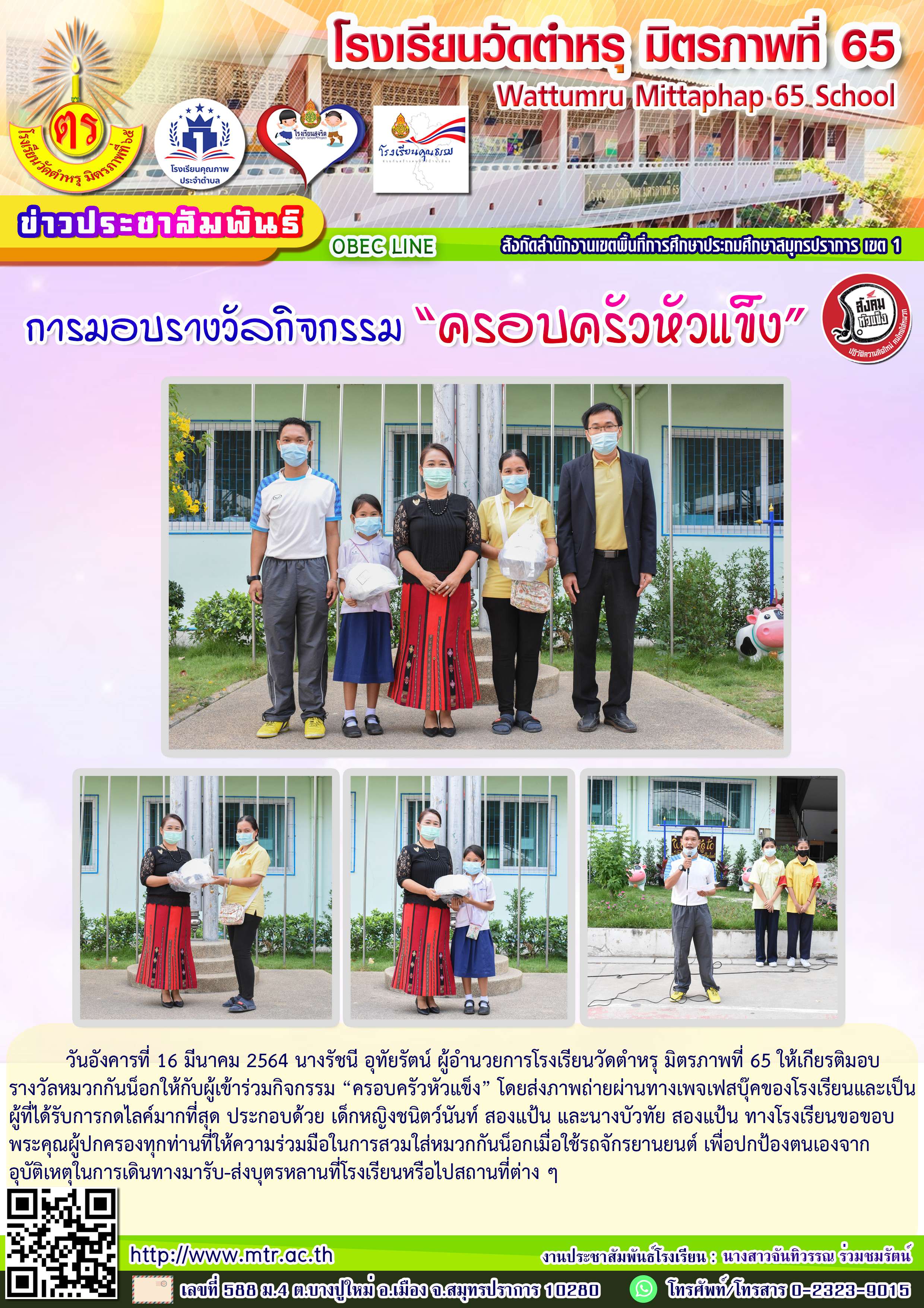 วันอังคารที่ 16 มีนาคม 2564 นางรัชนี อุทัยรัตน์ ผู้อำนวยการโรงเรียนวัดตำหรุ มิตรภาพที่ 65 ให้เกียรติมอบรางวัลหมวกกันน็อกให้กับผู้เข้าร่วมกิจกรรม “ครอบครัวหัวแข็ง” โดยส่งภาพถ่ายผ่านทางเพจเฟสบุ๊คของโรงเรียนและเป็นผู้ที่ได้รับการกดไลค์มากที่สุด ประกอบด้วย เด็กหญิงชนิตว์นันท์ สองแป้น และนางบัวทัย สองแป้น ทางโรงเรียนขอขอบพระคุณผู้ปกครองทุกท่านที่ให้ความร่วมมือในการสวมใส่หมวกกันน็อกเมื่อใช้รถจักรยานยนต์ เพื่อปกป้องตนเองจากอุบัติเหตุในการเดินทางมารับ-ส่งบุตรหลานที่โรงเรียนหรือไปสถานที่ต่าง ๆ