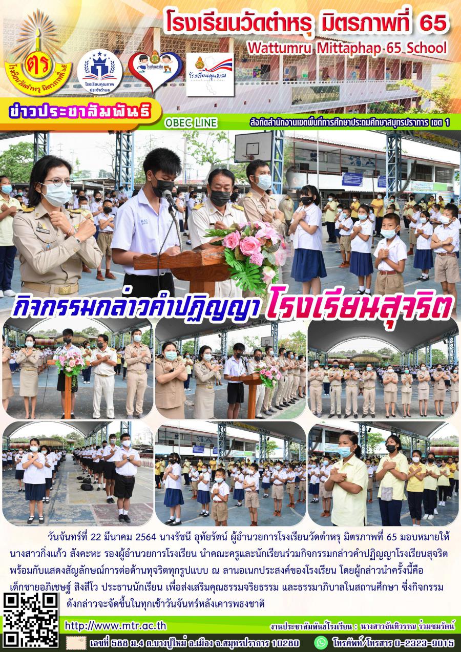 วันจันทร์ที่ 22 มีนาคม 2564 นางรัชนี อุทัยรัตน์ ผู้อำนวยการโรงเรียนวัดตำหรุ มิตรภาพที่ 65 มอบหมายให้นางสาวกิ่งแก้ว สังคะหะ รองผู้อำนวยการโรงเรียน นำคณะครูและนักเรียนร่วมกิจกรรมกล่าวคำปฏิญญาโรงเรียนสุจริต พร้อมกับแสดงสัญลักษณ์การต่อต้านทุจริตทุกรูปแบบ ณ ลานอเนกประสงค์ของโรงเรียน โดยผู้กล่าวนำครั้งนี้คือ เด็กชายอภิเชษฐ์ สิงสีโว ประธานนักเรียน เพื่อส่งเสริมคุณธรรมจริยธรรม และธรรมาภิบาลในสถานศึกษา ซึ่งกิจกรรมดังกล่าวจะจัดขึ้นในทุกเช้าวันจันทร์หลังเคารพธงชาติ