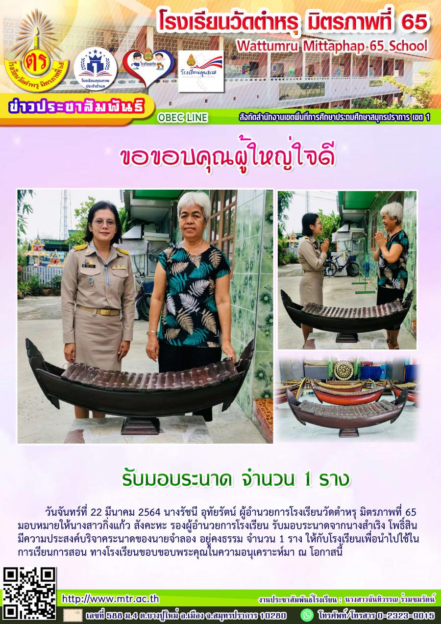 วันจันทร์ที่ 22 มีนาคม 2564 นางรัชนี อุทัยรัตน์ ผู้อำนวยการโรงเรียนวัดตำหรุ มิตรภาพที่ 65 มอบหมายให้นางสาวกิ่งแก้ว สังคะหะ รองผู้อำนวยการโรงเรียน รับมอบระนาดจากนางสำเริง โพธิ์สิน มีความประสงค์บริจาคระนาดของนายจำลอง อยู่คงธรรม จำนวน 1 ราง ให้กับโรงเรียนเพื่อนำไปใช้ในการเรียนการสอน ทางโรงเรียนขอขอบพระคุณในความอนุเคราะห์มา ณ โอกาสนี้