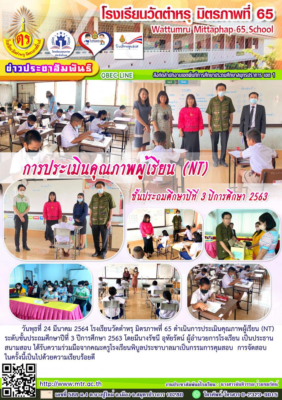 วันพุธที่ 24 มีนาคม 2564 โรงเรียนวัดตำหรุ มิตรภาพที่ 65 ดำเนินการประเมินคุณภาพผู้เรียน (NT) ระดับชั้นประถมศึกษาปีที่ 3 ปีการศึกษา 2563 โดยมีนางรัชนี อุทัยรัตน์ ผู้อำนวยการโรงเรียน เป็นประธานสนามสอบ ได้รับความร่วมมือจากคณะครูโรงเรียนพิบูลประชาบาลมาเป็นกรรมการคุมสอบ การจัดสอบในครั้งนี้เป็นไปด้วยความเรียบร้อยดี