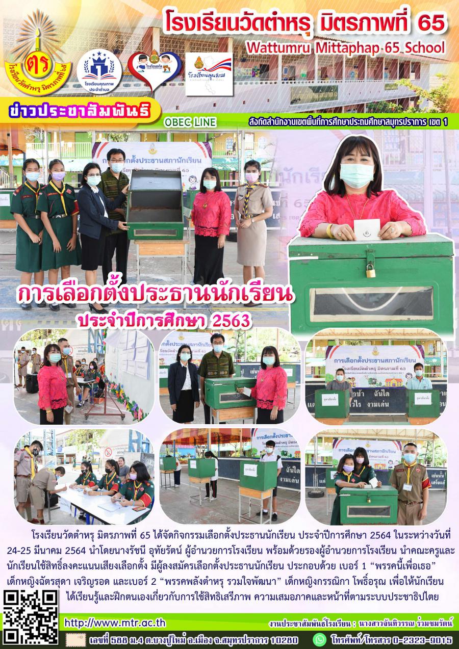 โรงเรียนวัดตำหรุ มิตรภาพที่ 65 ได้จัดกิจกรรมเลือกตั้งประธานนักเรียน ประจำปีการศึกษา 2564 ในระหว่างวันที่