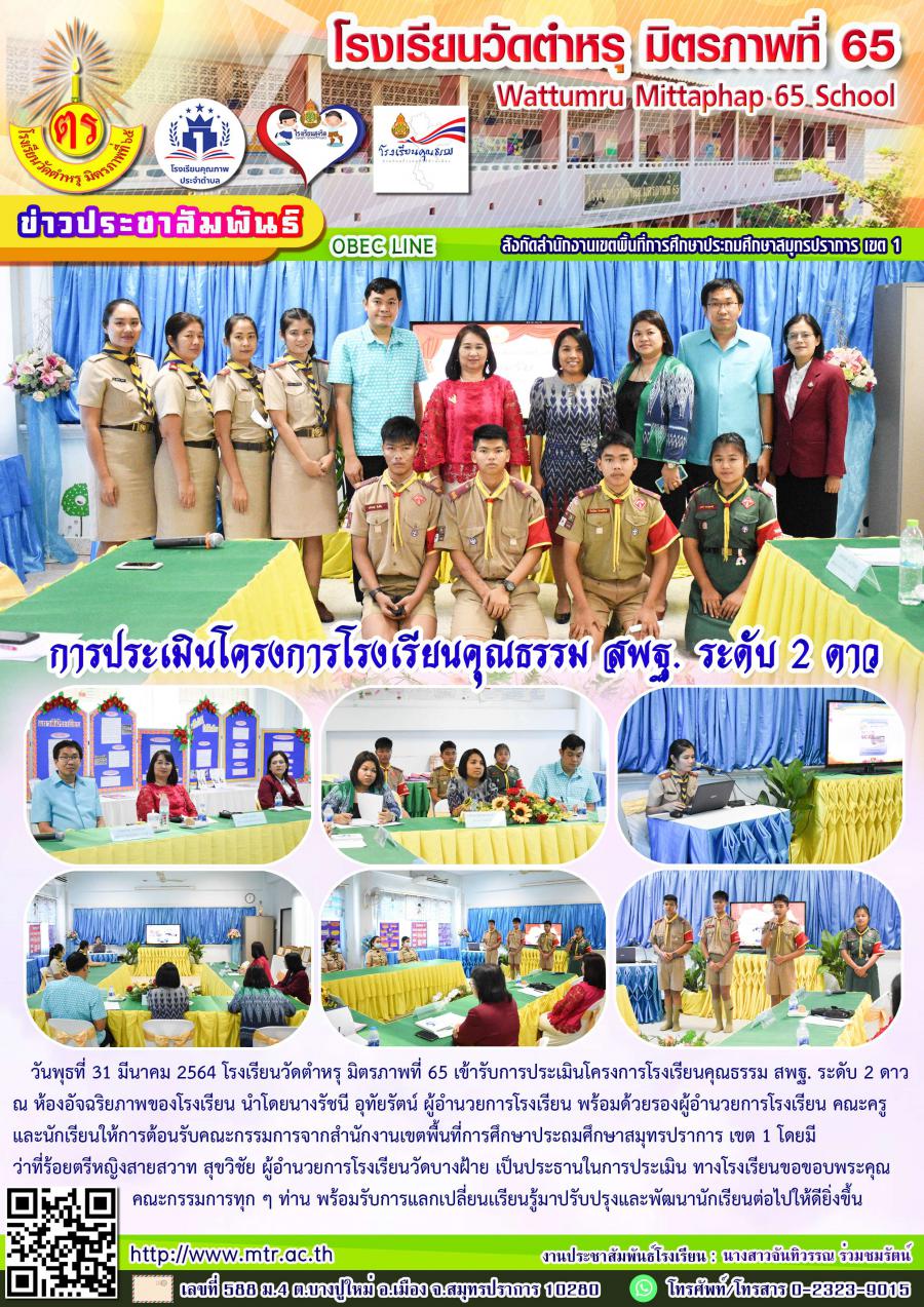 วันพุธที่ 31 มีนาคม 2564 โรงเรียนวัดตำหรุ มิตรภาพที่ 65 เข้ารับการประเมินโครงการโรงเรียนคุณธรรม สพฐ. ระดับ 2 ดาว ณ ห้องอัจฉริยภาพ นำโดยนางรัชนี อุทัยรัตน์ ผู้อำนวยการโรงเรียน พร้อมด้วยรองผู้อำนวยการโรงเรียน คณะครูและนักเรียนให้การต้อนรับคณะกรรมการจากสำนักงานเขตพื้นที่การศึกษาประถมศึกษาสมุทรปราการ เขต 1 โดยมีว่าที่ร้อยตรีหญิงสายสวาท สุขวิชัย ผู้อำนวยการโรงเรียนวัดบางฝ้าย เป็นประธานในการประเมิน ทางโรงเรียนขอขอบพระคุณคำแนะนำต่าง ๆ จากคณะกรรมการ นำมาปรับปรุงและพัฒนานักเรียนต่อไปให้ดียิ่งขึ้น