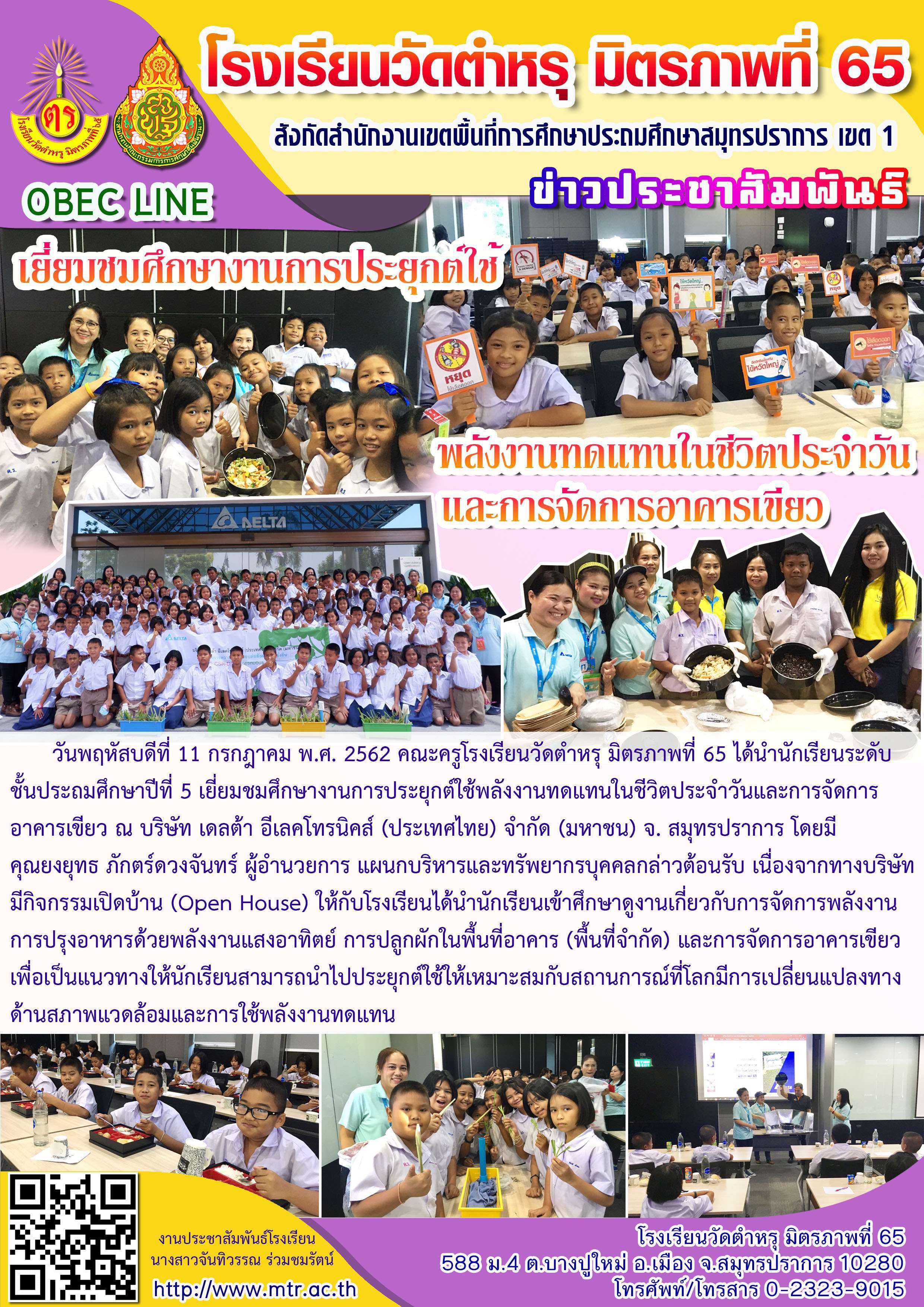 วันพฤหัสบดีที่ 11 กรกฎาคม พ.ศ. 2562 คณะครูโรงเรียนวัดตำหรุ มิตรภาพที่ 65 ได้นำนักเรียนระดับชั้นประถมศึกษาปีที่ 5 เยี่ยมชมศึกษางานการประยุกต์ใช้พลังงานทดแทนในชีวิตประจำวันและการจัดการอาคารเขียว ณ บริษัท เดลต้า อีเลคโทรนิคส์ (ประเทศไทย) จำกัด (มหาชน) จ. สมุทรปราการ โดยมีคุณยงยุทธ ภักตร์ดวงจันทร์ ผู้อำนวยการ แผนกบริหารและทรัพยากรบุคคลกล่าวต้อนรับ เนื่องจากทางบริษัทมีกิจกรรมเปิดบ้าน (Open House)ให้กับโรงเรียนได้นำนักเรียนเข้าศึกษาดูงานเกี่ยวกับการจัดการพลังงาน การปรุงอาหารด้วยพลังงานแสงอาทิตย์ การปลูกผักในพื้นที่อาคาร(พื้นที่จำกัด) และการจัดการอาคารเขียว เพื่อเป็นแนวทางให้นักเรียนสามารถนำไปประยุกต์ใช้ให้เหมาะสมกับสถานการณ์ที่โลกมีการเปลี่ยนแปลงทางด้านสภาพแวดล้อมและการใช้พลังงานทดแทน