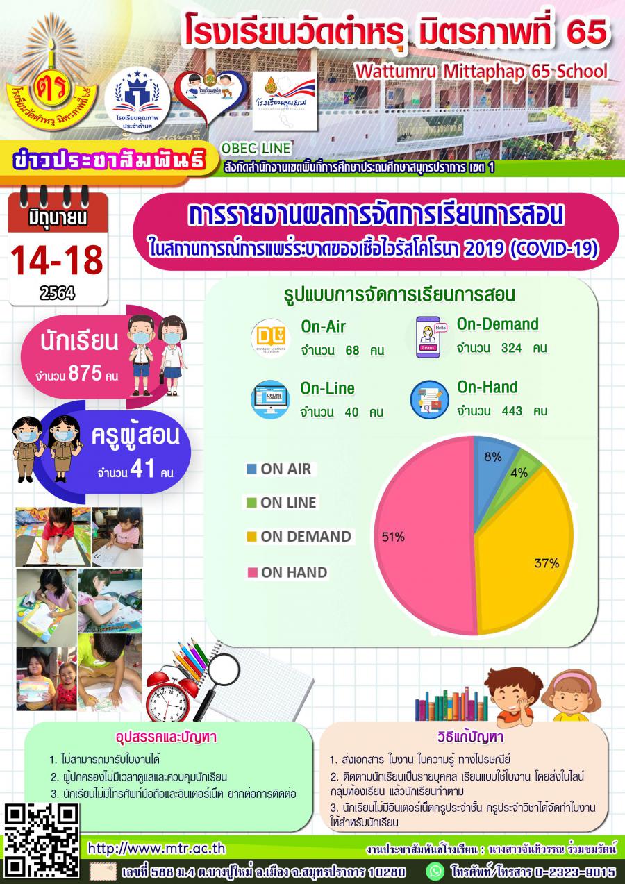 การรายงานผลการจัดการเรียนการสอน ในสถานการณ์การแพร่ระบาดของเชื้อไวรัสโคโรนา 2019 ในระหว่างวันที่ 14-18 มิถุนายน 2564