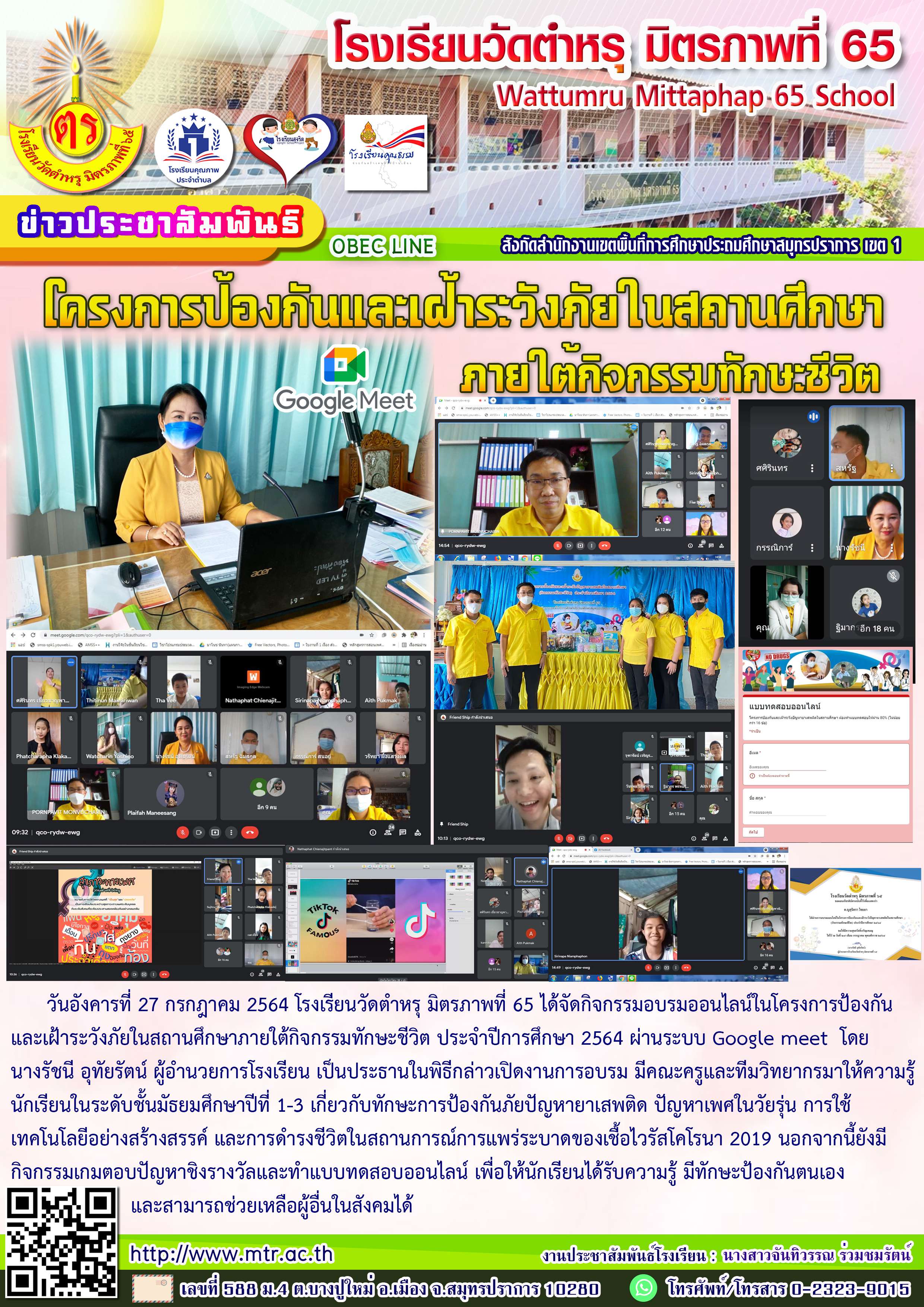 วันอังคารที่ 27 กรกฎาคม 2564 โรงเรียนวัดตำหรุ มิตรภาพที่ 65 ได้จัดกิจกรรมอบรมออนไลน์ในโครงการป้องกันและเฝ้าระวังภัยในสถานศึกษาภายใต้กิจกรรมทักษะชีวิต ประจำปีการศึกษา 2564 ผ่านระบบ Google meet โดยนางรัชนี อุทัยรัตน์ ผู้อำนวยการโรงเรียน เป็นประธานในพิธีกล่าวเปิดงานการอบรม มีคณะครูและทีมวิทยากรมาให้ความรู้นักเรียนในระดับชั้นมัธยมศึกษาปีที่ 1-3 เกี่ยวกับทักษะการป้องกันภัยปัญหายาเสพติด ปัญหาเพศในวัยรุ่น การใช้เทคโนโลยีอย่างสร้างสรรค์ และการดำรงชีวิตในสถานการณ์การแพร่ระบาดของเชื้อไวรัสโคโรนา 2019 นอกจากนี้ยังมีกิจกรรมเกมตอบปัญหาชิงรางวัลและทำแบบทดสอบออนไลน์ เพื่อให้นักเรียนได้รับความรู้ มีทักษะป้องกันตนเอง และสามารถช่วยเหลือผู้อื่นในสังคมได้