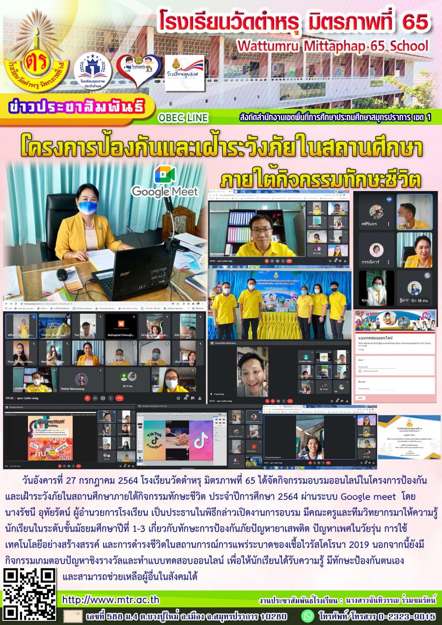 กิจกรรมอบรมออนไลน์ในโครงการป้องกันและเฝ้าระวังภัยในสถานศึกษาภายใต้กิจกรรมทักษะชีวิต ประจำปีการศึกษา 2564 ผ่านระบบ Google meet
