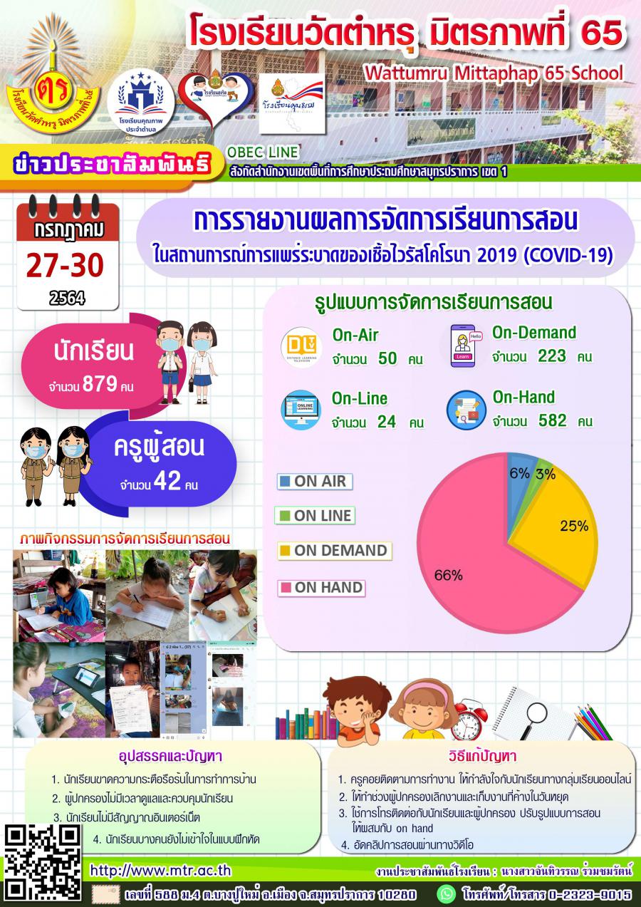การรายงานผลการจัดการเรียนการสอน ในสถานการณ์การแพร่ระบาดของเชื้อไวรัสโคโรนา 2019 ในระหว่างวันที่ 27 - 30 กรกฎาคม 2564