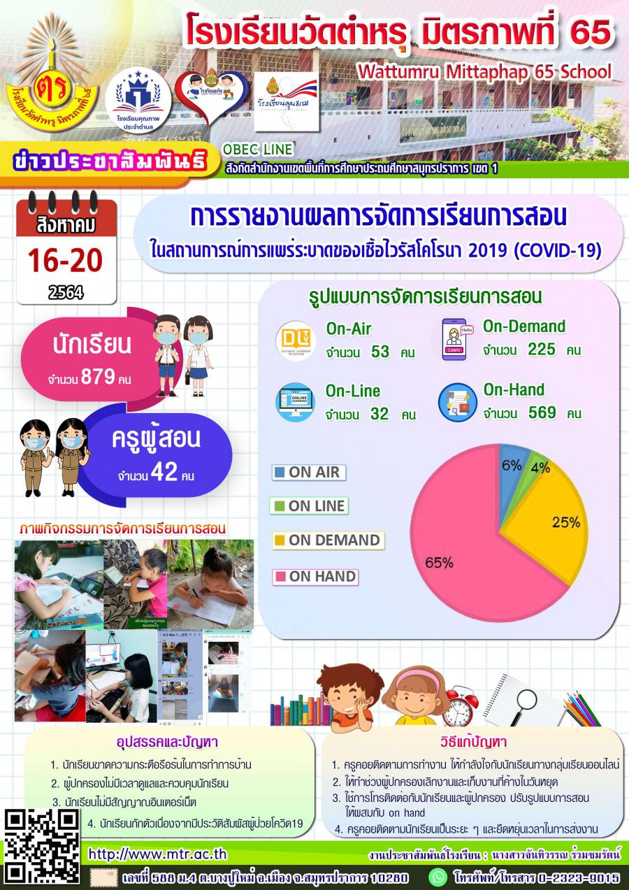 การรายงานผลการจัดการเรียนการสอน ในสถานการณ์การแพร่ระบาดของเชื้อไวรัสโคโรนา 2019 ในระหว่างวันที่ 16-20 สิงหาคม 2564