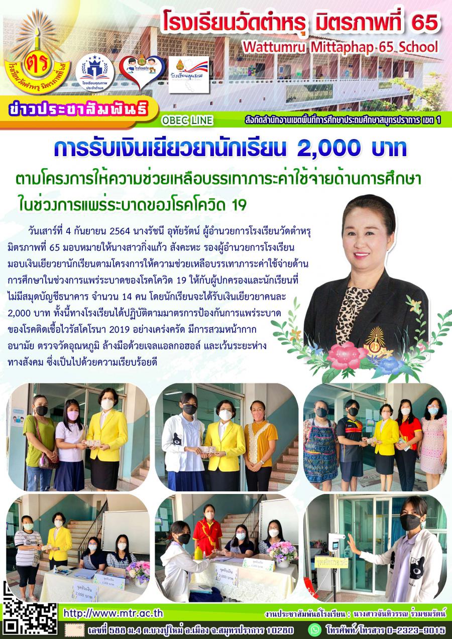 วันเสาร์ที่ 4 กันยายน 2564 นางรัชนี อุทัยรัตน์ ผู้อำนวยการโรงเรียนวัดตำหรุ มิตรภาพที่ 65 มอบหมายให้นางสาวกิ่งแก้ว สังคะหะ รองผู้อำนวยการโรงเรียนมอบเงินเยียวยานักเรียนตามโครงการให้ความช่วยเหลือบรรเทาภาระค่าใช้จ่ายด้านการศึกษาในช่วงการแพร่ระบาดของโรคโควิด 19 ให้กับผู้ปกครองและนักเรียนที่ไม่มีสมุดบัญชีธนาคาร จำนวน 14 คน โดยนักเรียนจะได้รับเงินเยียวยาคนละ 2,000 บาท ทั้งนี้ทางโรงเรียนได้ปฏิบัติตามมาตรการป้องกันการแพร่ระบาดของโรคติดเชื้อไวรัสโคโรนา 2019 อย่างเคร่งครัด มีการสวมหน้ากากอนามัย ตรวจวัดอุณหภูมิ ล้างมือด้วยเจลแอลกอฮอล์ และเว้นระยะห่างทางสังคม ซึ่งเป็นไปด้วยความเรียบร้อยดี