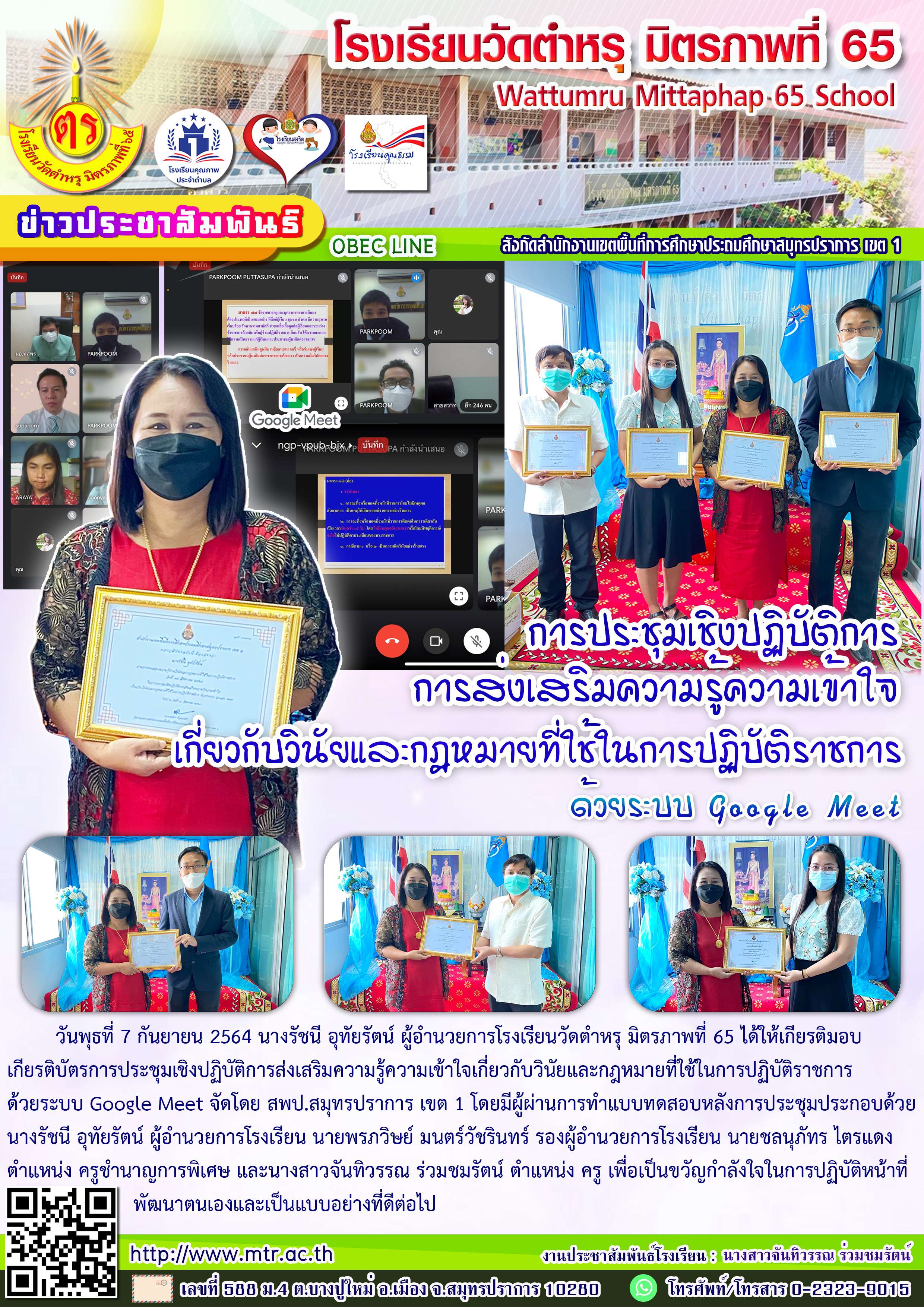 วันพุธที่ 7 กันยายน 2564 นางรัชนี อุทัยรัตน์ ผู้อำนวยการโรงเรียนวัดตำหรุ มิตรภาพที่ 65 ได้ให้เกียรติมอบเกียรติบัตรการประชุมเชิงปฏิบัติการส่งเสริมความรู้ความเข้าใจเกี่ยวกับวินัยและกฎหมายที่ใช้ในการปฏิบัติราชการด้วยระบบ Google Meet จัดโดย สพป.สมุทรปราการ เขต 1 โดยมีผู้ผ่านการทำแบบทดสอบหลังการประชุมประกอบด้วยนางรัชนี อุทัยรัตน์ ผู้อำนวยการโรงเรียน นายพรภวิษย์ มนตร์วัชรินทร์ รองผู้อำนวยการโรงเรียน นายชลนุภัทร ไตรแดง ตำแหน่ง ครูชำนาญการพิเศษ และนางสาวจันทิวรรณ ร่วมชมรัตน์ ตำแหน่ง ครู เพื่อเป็นขวัญกำลังใจในการปฏิบัติหน้าที่พัฒนาตนเองและเป็นแบบอย่างที่ดีต่อไป