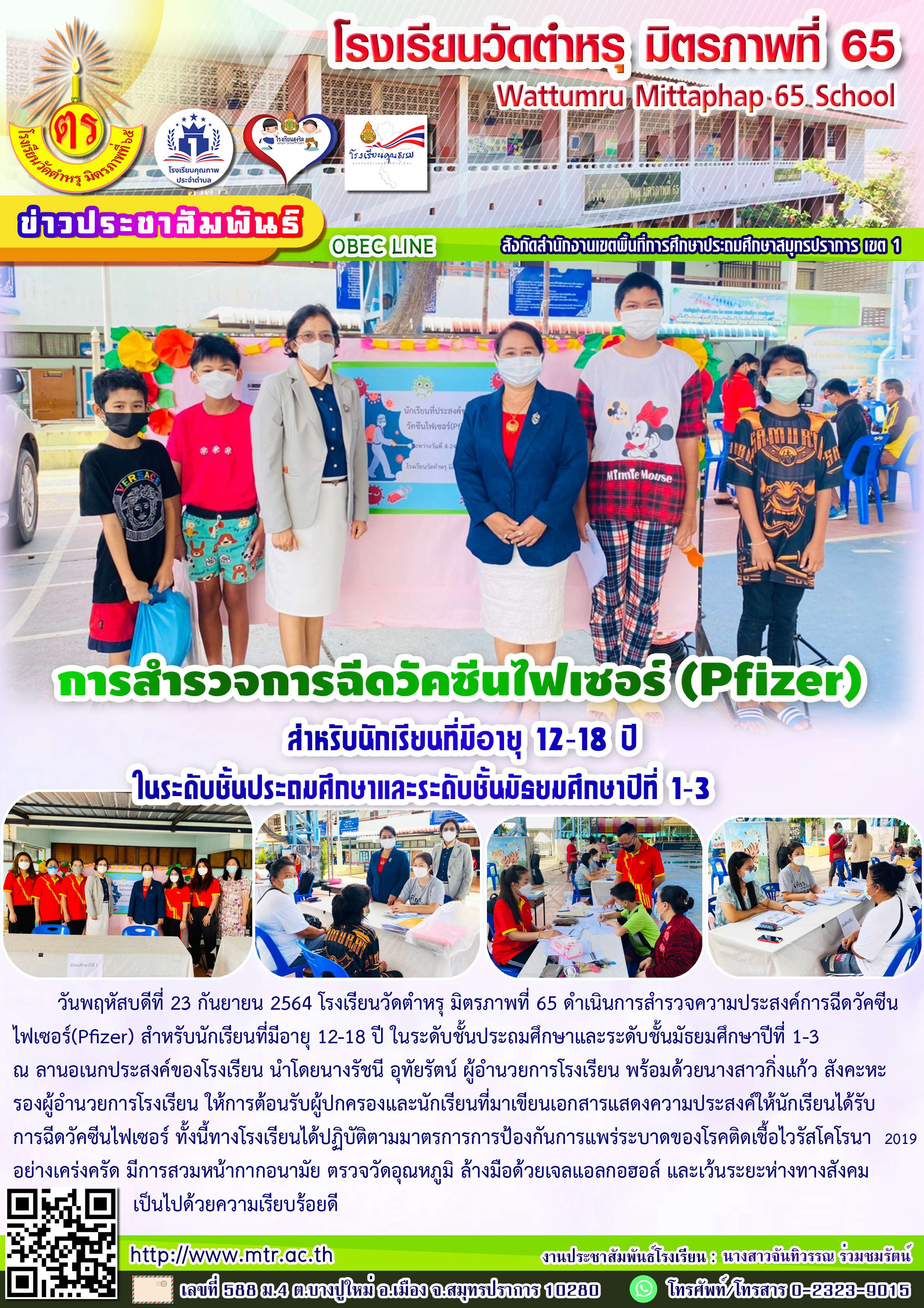 วันพฤหัสบดีที่ 23 กันยายน 2564 โรงเรียนวัดตำหรุ มิตรภาพที่ 65 ดำเนินการสำรวจความประสงค์การฉีดวัคซีนไฟเซอร์(Pfizer) สำหรับนักเรียนที่มีอายุ 12-18 ปี ในระดับชั้นประถมศึกษาและระดับชั้นมัธยมศึกษาปีที่ 1-3 ณ ลานอเนกประสงค์ของโรงเรียน นำโดยนางรัชนีอุทัยรัตน์ ผู้อำนวยการโรงเรียน พร้อมด้วยนางสาวกิ่งแก้ว สังคะหะ รองผู้อำนวยการโรงเรียน ให้การต้อนรับผู้ปกครองและนักเรียนที่มาเขียนเอกสารแสดงความประสงค์ให้นักเรียนได้รับการฉีดวัคซีนไฟเซอร์ ทั้งนี้ทางโรงเรียนได้ปฏิบัติตามมาตรการการป้องกันการแพร่ระบาดของโรคติดเชื้อไวรัสโคโรนา 2019 อย่างเคร่งครัด มีการสวมหน้ากากอนามัย ตรวจวัดอุณหภูมิ ล้างมือด้วยเจลแอลกอฮอล์ และเว้นระยะห่างทางสังคมเป็นไปด้วยความเรียบร้อยดี