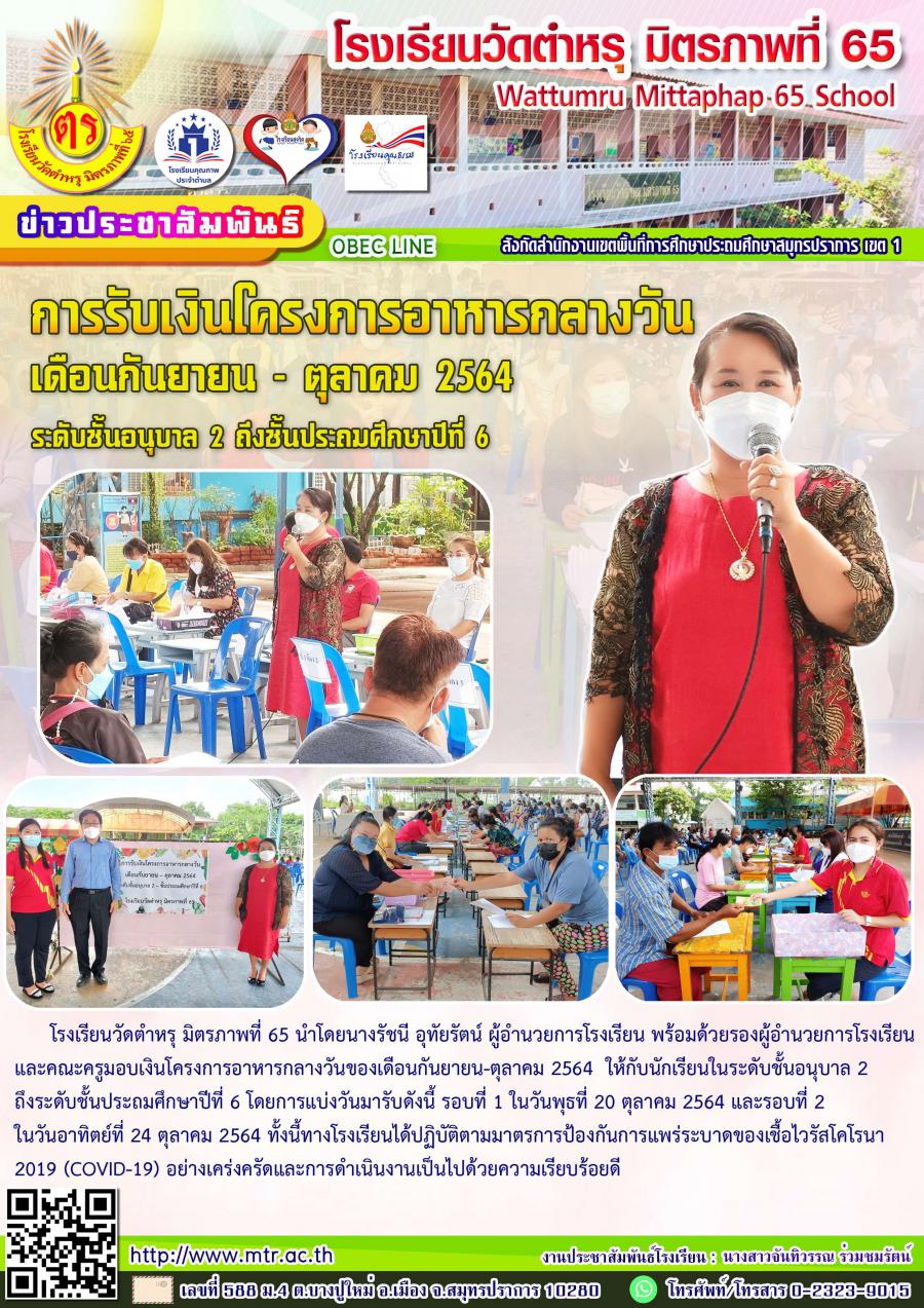 โรงเรียนวัดตำหรุ มิตรภาพที่ 65 นำโดยนางรัชนี อุทัยรัตน์ ผู้อำนวยการโรงเรียน พร้อมด้วยรองผู้อำนวยการโรงเรียนและคณะครูมอบเงินโครงการอาหารกลางวันของเดือนกันยายน-ตุลาคม 2564 ให้กับนักเรียนในระดับชั้นอนุบาล 2 ถึงระดับชั้นประถมศึกษาปีที่ 6 โดยการแบ่งวันมารับดังนี้ รอบที่ 1 ในวันพุธที่ 20 ตุลาคม 2564 และรอบที่ 2 ในวันอาทิตย์ที่ 24 ตุลาคม 2564 ทั้งนี้ทางโรงเรียนได้ปฏิบัติตามมาตรการป้องกันการแพร่ระบาดของเชื้อไวรัสโคโรนา 2019 (COVID-19) อย่างเคร่งครัดและการดำเนินงานเป็นไปด้วยความเรียบร้อยดี