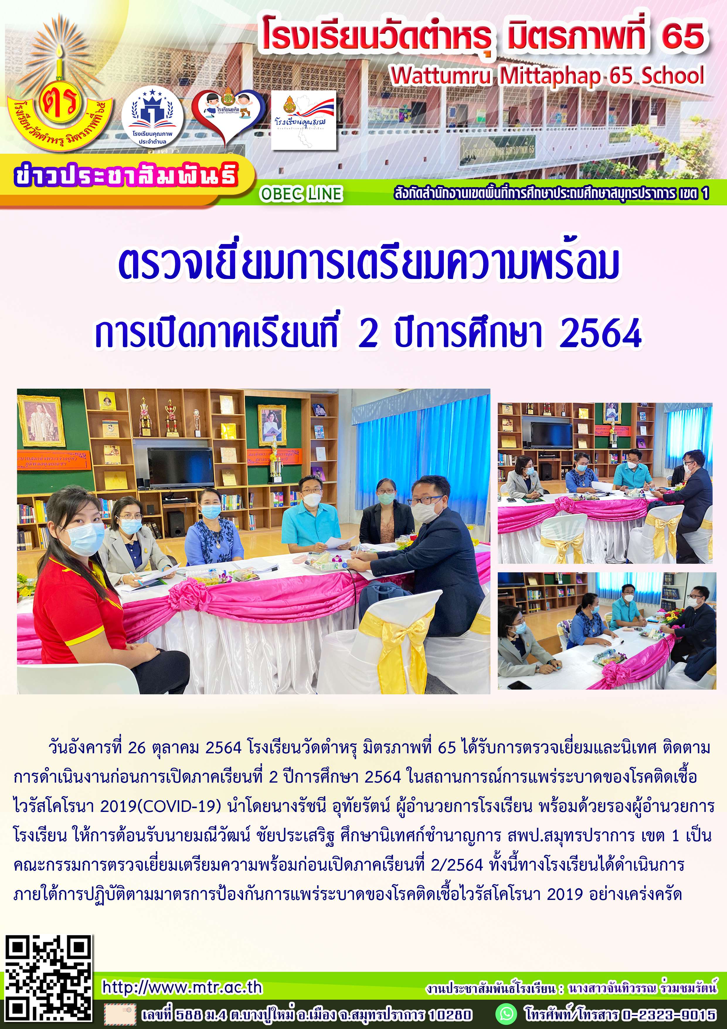 วันอังคารที่ 26 ตุลาคม 2564 โรงเรียนวัดตำหรุ มิตรภาพที่ 65 ได้รับการตรวจเยี่ยมและนิเทศ ติดตามการดำเนินงานก่อนการเปิดภาคเรียนที่ 2 ปีการศึกษา 2564 ในสถานการณ์การแพร่ระบาดของโรคติดเชื้อไวรัสโคโรนา 20 19(COVID-19) นำโดยนางรัชนี อุทัยรัตน์ ผู้อำนวยการโรงเรียน พร้อมด้วยรองผู้อำนวยการโรงเรียน ให้การต้อนรับนายมณีวัฒน์ ชัยประเสริฐ ศึกษานิเทศก์ชำนาญการ สพป.สมุทรปราการ เขต 1 เป็นคณะกรรมการตรวจเยี่ยมเตรียมความพร้อมก่อนเปิดภาคเรียนที่ 2/2564 ทั้งนี้ทางโรงเรียนได้ดำเนินการภายใต้การปฏิบัติตามมาตรการป้องกันการแพร่ระบาดของโรคติดเชื้อไวรัสโคโรนา 2019 อย่างเคร่งครัด