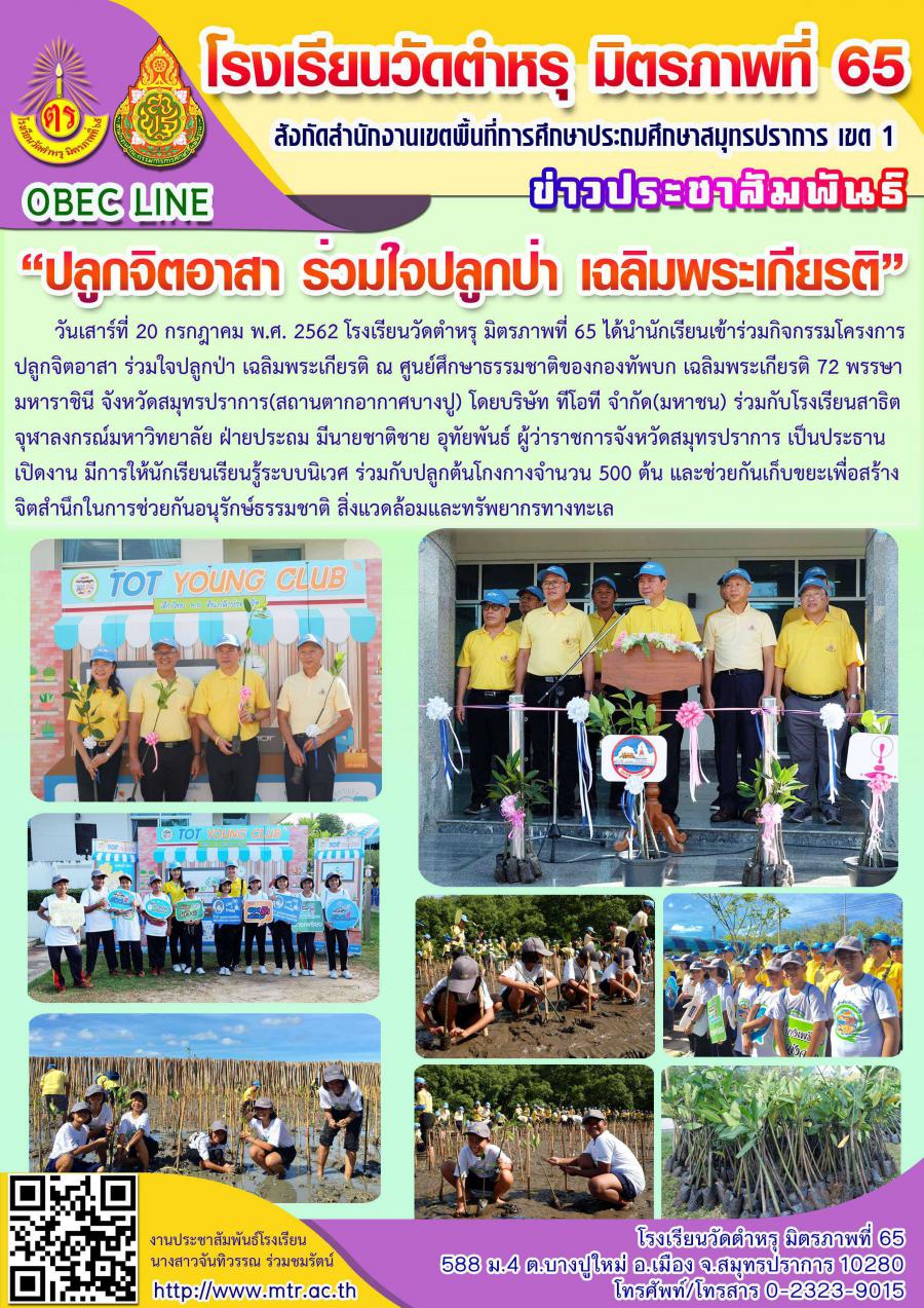 วันเสาร์ที่ 20 กรกฎาคม พ.ศ. 2562 โรงเรียนวัดตำหรุ มิตรภาพที่ 65 ได้นำนักเรียนเข้าร่วมกิจกรรม โครงการปลูกจิตอาสา ร่วมใจปลูกป่า เฉลิมพระเกียรติ ณ ศูนย์ศึกษาธรรมชาติของกองทัพบก เฉลิมพระเกียรติ 72 พรรษามหาราชินี จังหวัดสมุทรปราการ(สถานตากอากาศบางปู) โดยบริษัท ทีโอที จำกัด(มหาชน) ร่วมกับโรงเรียนสาธิตจุฬาลงกรณ์มหาวิทยาลัย ฝ่ายประถม มีนายชาติชาย อุทัยพันธ์ ผู้ว่าราชการจังหวัดสมุทรปราการ เป็นประธานเปิดงาน มีการให้นักเรียนเรียนรู้ระบบนิเวศ ร่วมกับปลูกต้นโกงกางจำนวน 500 ต้น และช่วยกันเก็บขยะเพื่อสร้างจิตสำนึกในการช่วยกันอนุรักษ์ธรรมชาติ สิ่งแวดล้อมและทรัพยากรทางทะเล