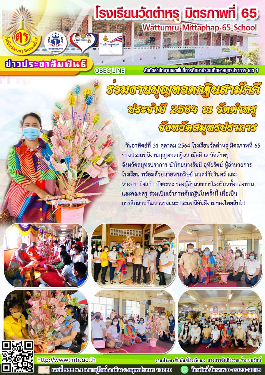 วันอาทิตย์ที่ 31 ตุลาคม 2564 โรงเรียนวัดตำหรุ มิตรภาพที่ 65 ร่วมประเพณีงานบุญทอดกฐินสามัคคี ณ วัดตำหรุ จังหวัดสมุทรปราการ นำโดยนางรัชนี อุทัยรัตน์ ผู้อำนวยการโรงเรียน พร้อมด้วยนายพรภวิษย์ มนตร์วัชรินทร์ และนางสาวกิ่งแก้ว สังคะหะ รองผู้อำนวยการโรงเรียนทั้งสองท่าน และคณะครู ร่วมเป็นเจ้าภาพต้นกฐินในครั้งนี้ เพื่อเป็นการสืบสานวัฒนธรรมและประเพณีอันดีงามของไทยสืบไป