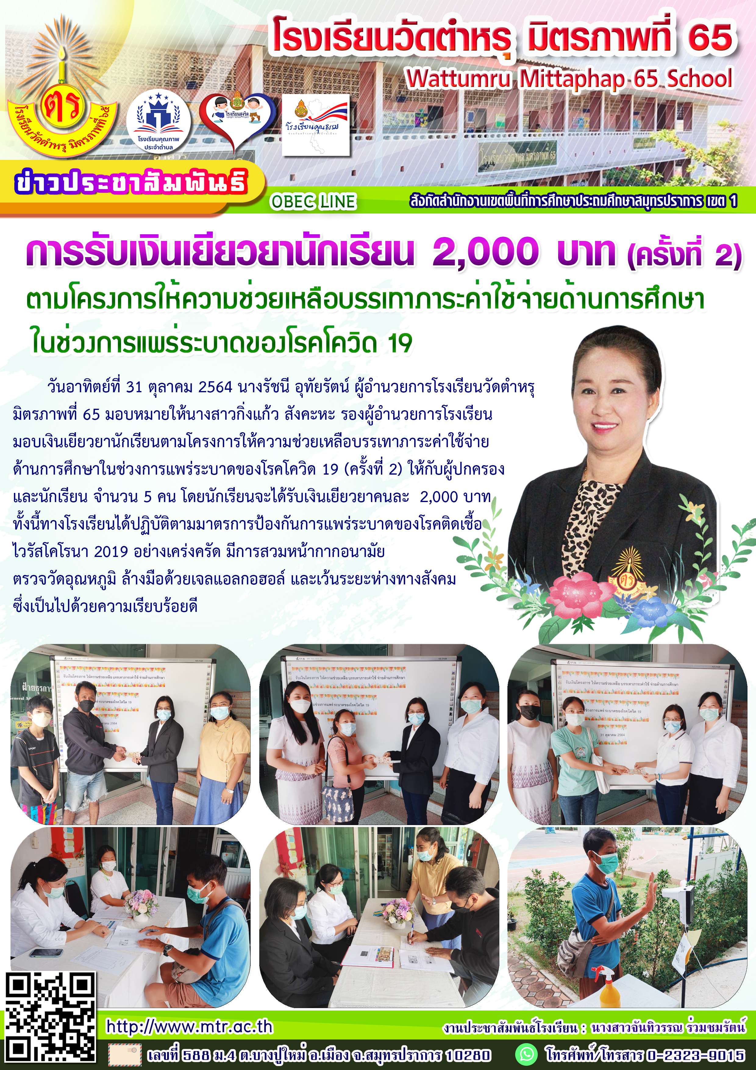 วันอาทิตย์ที่ 31 ตุลาคม 2564 นางรัชนี อุทัยรัตน์ ผู้อำนวยการโรงเรียนวัดตำหรุ มิตรภาพที่ 65 มอบหมายให้นางสาวกิ่งแก้ว สังคะหะ รองผู้อำนวยการโรงเรียนมอบเงินเยียวยานักเรียนตามโครงการให้ความช่วยเหลือบรรเทาภาระค่าใช้จ่ายด้านการศึกษาในช่วงการแพร่ระบาดของโรคโควิด 19 (ครั้งที่ 2)ให้กับผู้ปกครองและนักเรียน จำนวน 5 คน โดยนักเรียนจะได้รับเงินเยียวยาคนละ 2,000 บาท ทั้งนี้ทางโรงเรียนได้ปฏิบัติตามมาตรการป้องกันการแพร่ระบาดของโรคติดเชื้อไวรัสโคโรนา 2019 อย่างเคร่งครัด มีการสวมหน้ากากอนามัย ตรวจวัดอุณหภูมิ ล้างมือด้วยเจลแอลกอฮอล์ และเว้นระยะห่างทางสังคม ซึ่งเป็นไปด้วยความเรียบร้อยดี