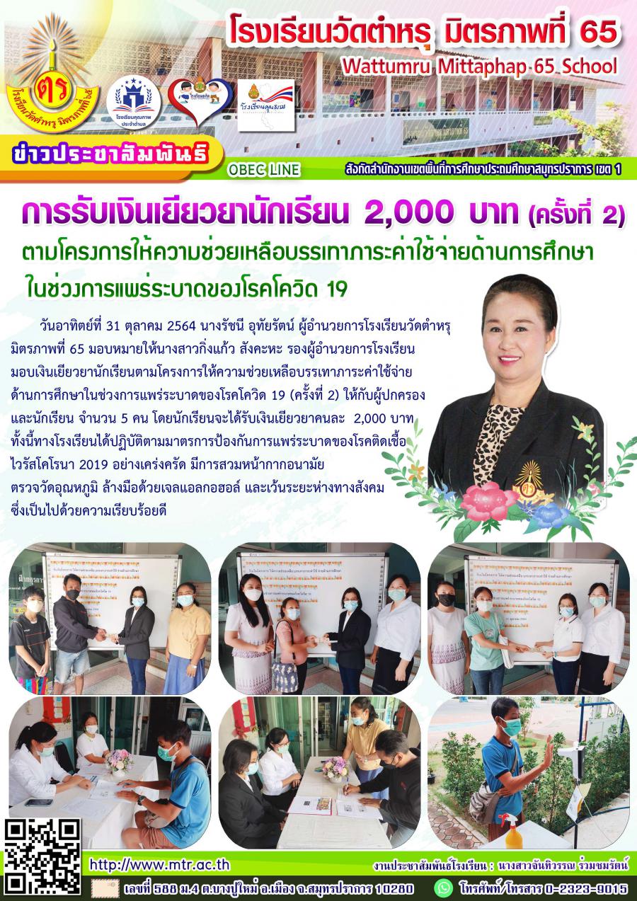 มอบเงินเยียวยานักเรียนตามโครงการให้ความช่วยเหลือบรรเทาภาระค่าใช้จ่ายด้านการศึกษาในช่วงการแพร่ระบาดของโรคโควิด 19 (ครั้งที่ 2)