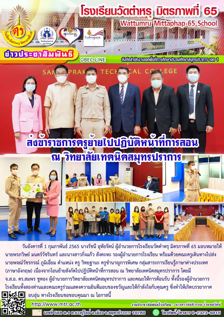 วันอังคารที่ 1 กุมภาพันธ์ 2565 นางรัชนี อุทัยรัตน์ ผู้อำนวยการโรงเรียนวัดตำหรุ มิตรภาพที่ 65 มอบหมายให้นายพรภวิษย์ มนตร์วัชรินทร์ และนางสาวกิ่งแก้ว สังคะหะ รองผู้อำนวยการโรงเรียน พร้อมด้วยคณะครูเดินทางไปส่งนายพจณ์วัชรกรณ์ ภูมิเอี่ยม ตำแหน่ง ครู วิทยฐานะ ครูชำนาญการพิเศษ กลุ่มสาระการเรียนรู้ภาษาต่างประเทศ(ภาษาอังกฤษ) เนื่องจากโอนย้ายสังกัดไปปฏิบัติหน้าที่การสอน ณ วิทยาลัยเทคนิคสมุทรปราการ โดยมี จ.ส.อ. ดร.สมพร ชูทอง ผู้อำนวยการวิทยาลัยเทคนิคสมุทรปราการ และคณะให้การต้อนรับ ทั้งนี้รองผู้อำนวยการโรงเรียนทั้งสองท่านและคณะครูร่วมแสดงความยินดีมอบของขวัญและให้กำลังใจกับคุณครู ซึ่งทำให้เกิดบรรยากาศอบอุ่น ทางโรงเรียนขอขอบคุณมา ณ โอกาสนี้