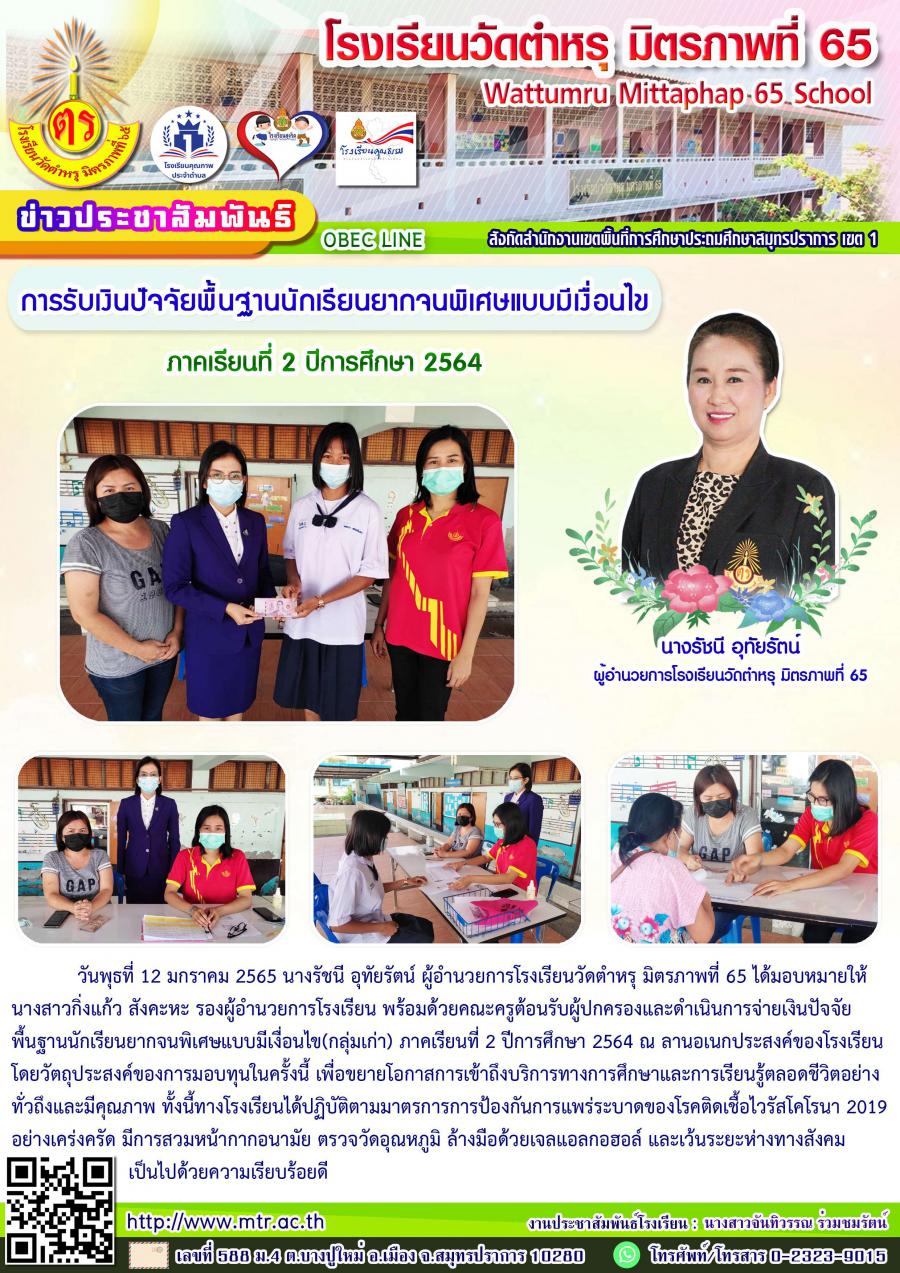 วันพุธที่ 12 มกราคม 2565 นางรัชนี อุทัยรัตน์ ผู้อำนวยการโรงเรียนวัดตำหรุ มิตรภาพที่ 65 ได้มอบหมายให้นางสาวกิ่งแก้ว สังคะหะ รองผู้อำนวยการโรงเรียน พร้อมด้วยคณะครูต้อนรับผู้ปกครองและดำเนินการจ่ายเงินปัจจัยพื้นฐานนักเรียนยากจนพิเศษแบบมีเงื่อนไข(กลุ่มเก่า) ภาคเรียนที่ 2 ปีการศึกษา 2564 ณ ลานอเนกประสงค์ของโรงเรียน