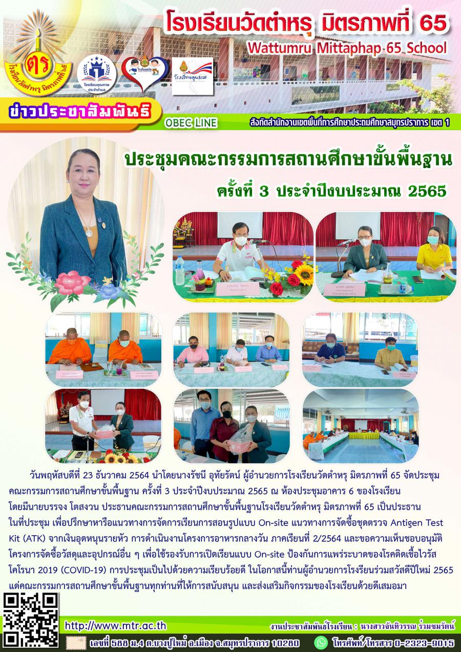 วันพฤหัสบดีที่ 23 ธันวาคม 2564 นำโดยนางรัชนี อุทัยรัตน์ ผู้อำนวยการโรงเรียนวัดตำหรุ มิตรภาพที่ 65 จัดประชุมคณะกรรมการสถานศึกษาขั้นพื้นฐาน ครั้งที่ 3 ประจำปีงบประมาณ 2565 ณ ห้องประชุมอาคาร 6 ของโรงเรียน โดยมีนายบรรจง โตสงวน ประธานคณะกรรมการสถานศึกษาขั้นพื้นฐานโรงเรียนวัดตำหรุ มิตรภาพที่ 65 เป็นประธานในที่ประชุม เพื่อปรึกษาหารือแนวทางการจัดการเรียนการสอนรูปแบบ On-site แนวทางการจัดซื้อชุดตรวจ Antigen Test Kit (ATK) จากเงินอุดหนุนรายหัว การดำเนินงานโครงการอาหารกลางวัน ภาคเรียนที่ 2/2564 และขอความเห็นชอบอนุมัติโครงการจัดซื้อวัสดุและอุปกรณ์อื่น ๆ เพื่อใช้รองรับการเปิดเรียนแบบ On-site ป้องกันการแพร่ระบาดของโรคติดเชื้อไวรัสโคโรนา 2019 (COVID-19) การประชุมเป็นไปด้วยความเรียบร้อยดี ในโอกาสนี้ท่านผู้อำนวยการโรงรียนร่วมสวัสดีปีใหม่ 2565 แด่คณะกรรมการสถานศึกษาขั้นพื้นฐานทุกท่านที่ให้การสนับสนุน และส่งเสริมกิจกรรมของโรงเรียนด้วยดีเสมอมา