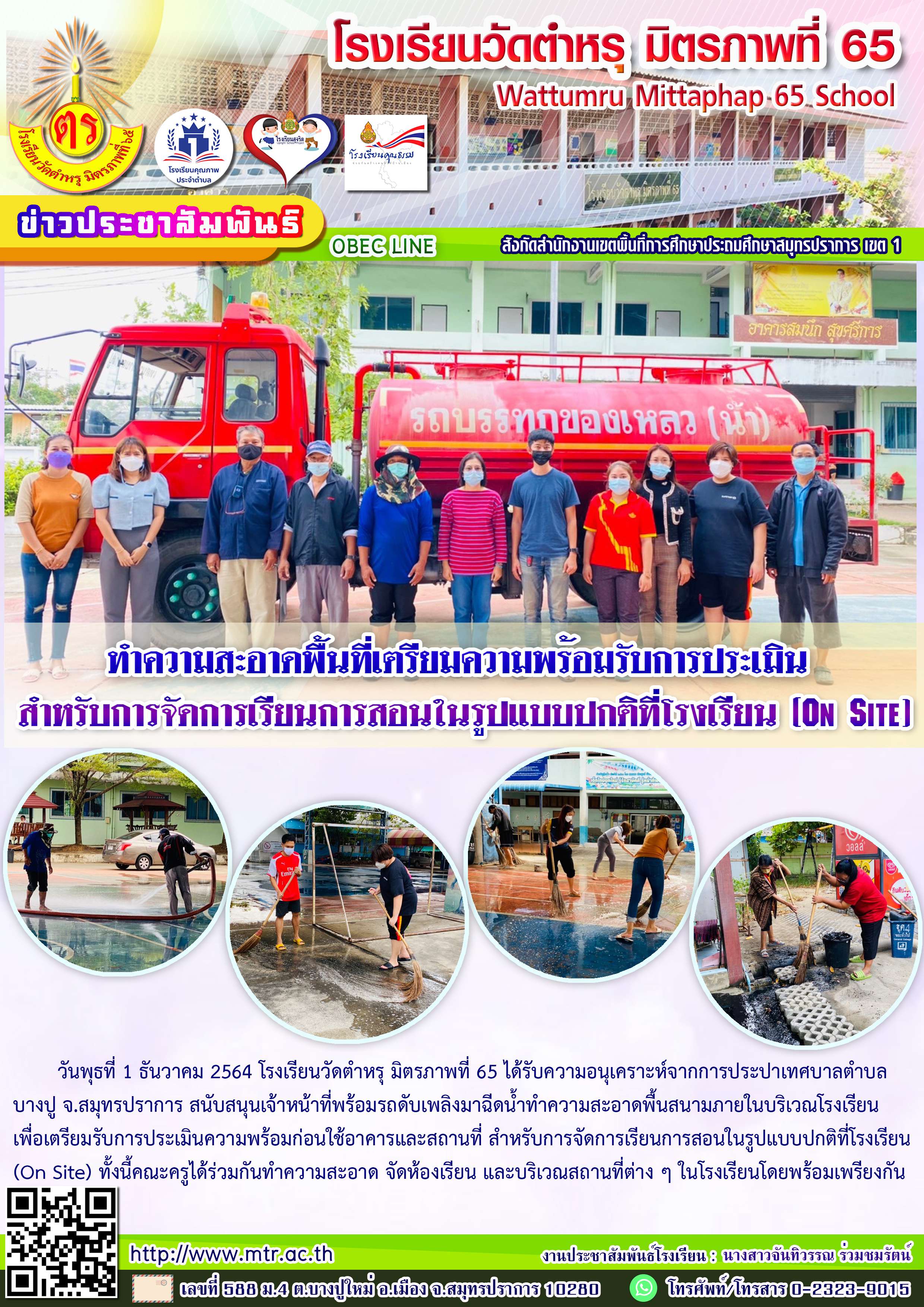 วันพุธที่ 1 ธันวาคม 2564 โรงเรียนวัดตำหรุ มิตรภาพที่ 65 ได้รับความอนุเคราะห์จากการประปาเทศบาลตำบลบางปู จ.สมุทรปราการ สนับสนุนเจ้าหน้าที่พร้อมรถดับเพลิงมาฉีดน้ำทำความสะอาดพื้นสนามภายในบริเวณโรงเรียน เพื่อเตรียมรับการประเมินความพร้อมก่อนใช้อาคารและสถานที่ สำหรับการจัดการเรียนการสอนในรูปแบบปกติที่โรงเรียน (On Site) ทั้งนี้คณะครูได้ร่วมกันทำความสะอาด จัดห้องเรียน และบริเวณสถานที่ต่าง ๆ ในโรงเรียนโดยพร้อมเพรียงกัน
