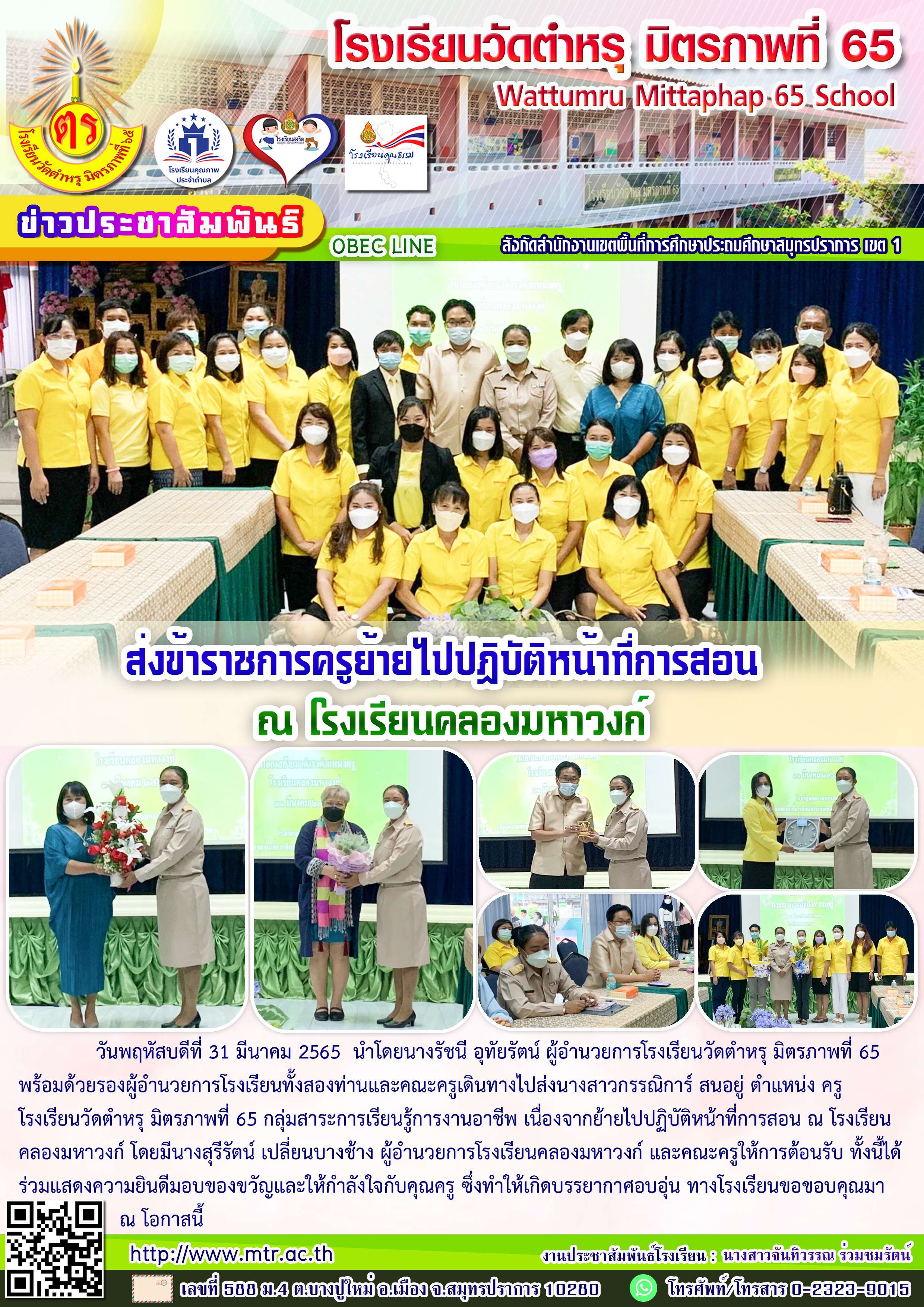 ส่งข้าราชการครูย้ายไปปฏิบัติหน้าที่การสอน ณ โรงเรียนคลองมหาวงก์