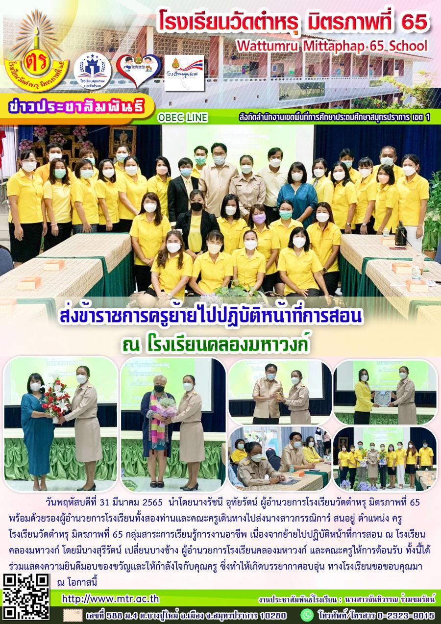 วันพฤหัสบดีที่ 31 มีนาคม 2565 นำโดยนางรัชนี อุทัยรัตน์ ผู้อำนวยการโรงเรียนวัดตำหรุ มิตรภาพที่ 65 พร้อมด้วยรองผู้อำนวยการโรงเรียนทั้งสองท่านและคณะครูเดินทางไปส่งนางสาวกรรณิการ์ สนอยู่ ตำแหน่ง ครู โรงเรียนวัดตำหรุ มิตรภาพที่ 65 กลุ่มสาระการเรียนรู้การงานอาชีพ เนื่องจากย้ายไปปฏิบัติหน้าที่การสอน ณ โรงเรียนคลองมหาวงก์ โดยมีนางสุรีรัตน์ เปลี่ยนบางช้าง ผู้อำนวยการโรงเรียนคลองมหาวงก์ และคณะครูให้การต้อนรับ ทั้งนี้ได้ร่วมแสดงความยินดีมอบของขวัญและให้กำลังใจกับคุณครู ซึ่งทำให้เกิดบรรยากาศอบอุ่น ทางโรงเรียนขอขอบคุณมา ณ โอกาสนี้